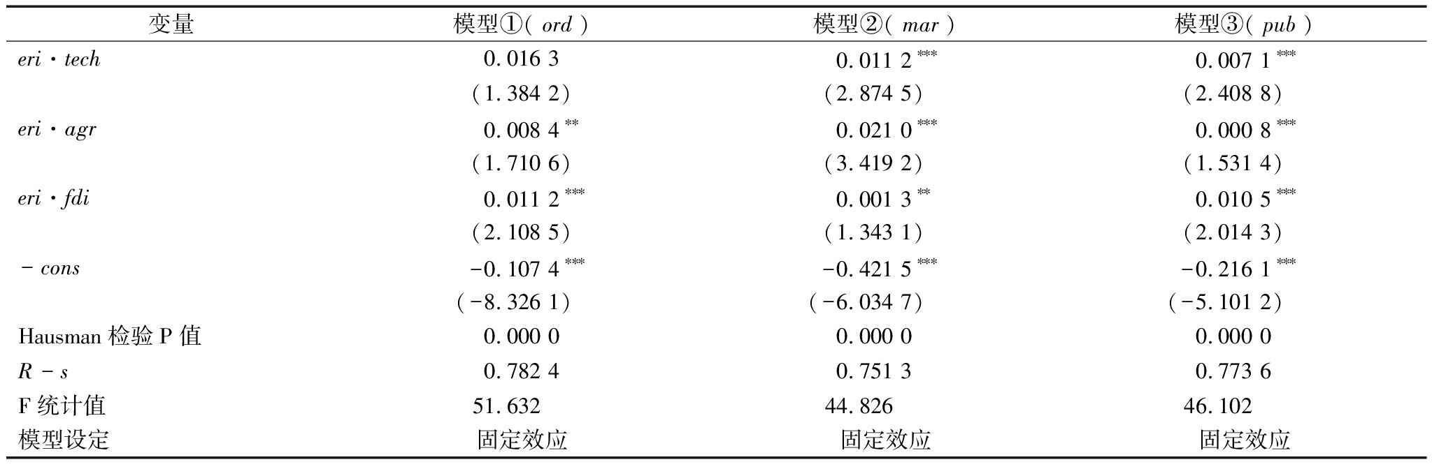 变量模型①(ord)模型②(mar)模型③(pub)eri·tech0.016 30.011 2∗∗∗0.007 1∗∗∗(1.384 2)(2.874 5)(2.408 8)eri·agr0.008 4∗∗0.021 0∗∗∗0.000 8∗∗∗(1.710 6)(3.419 2)(1.531 4)eri·fdi0.011 2∗∗∗0.001 3∗∗0.010 5∗∗∗(2.108 5)(1.343 1)(2.014 3)-cons-0.107 4∗∗∗-0.421 5∗∗∗-0.216 1∗∗∗(-8.326 1)(-6.034 7)(-5.101 2)Hausman检验P值0.000 00.000 00.000 0R-s0.782 40.751 30.773 6F统计值51.63244.82646.102模型设定固定效应固定效应固定效应
