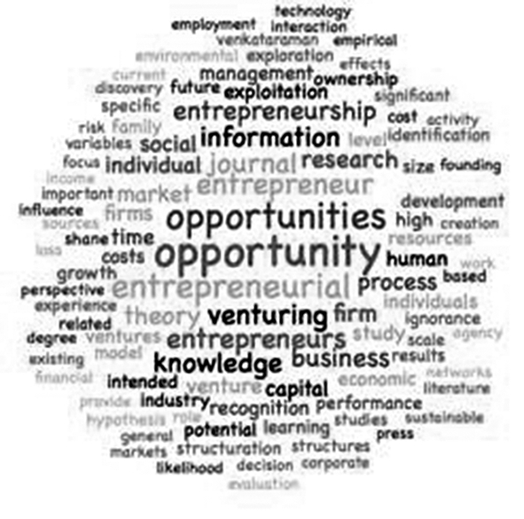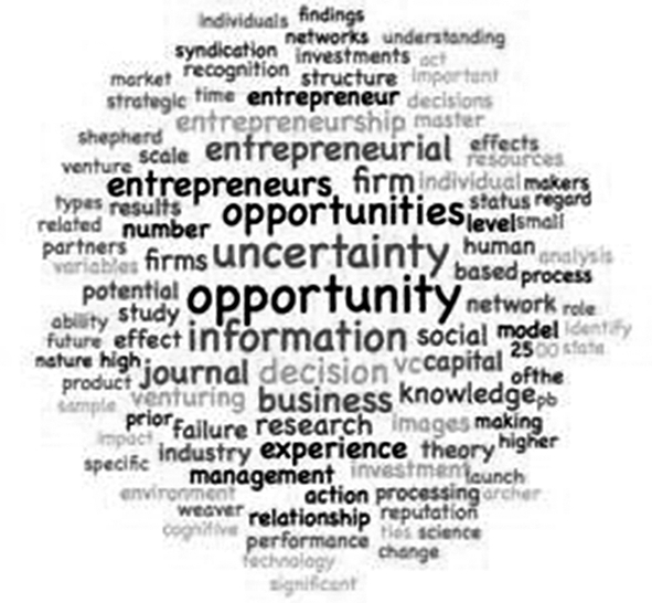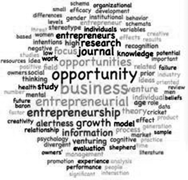 (3)2009-2011年研究论文数量为7篇,主题主要集中在创业机会识别、企业家经验、机会认知、企业家行为等方面。从图5词云图可以看出,这一阶段的研究主要集中在“opportunity”、“uncertainty”、“information”等方面,即信息处理与机会识别及未来不确定性间的关系。这一阶段的研究已逐渐从创业者转入到企业家相关机会识别等方面。创业活动不确定性的直接结果是导致创业行为失败,有经验的创业者能够识别更多机会、创造更多价值。然而,创业者的失败经验不会一直减少企业创新机会识别数量,两者呈倒U型关系,但其对创新机会开发却没有直接影响[13]。此外,对外界信息的处理是创业机会建构的重要步骤,创业者信息处理方式有助于帮助创业者识别更多外部机会。