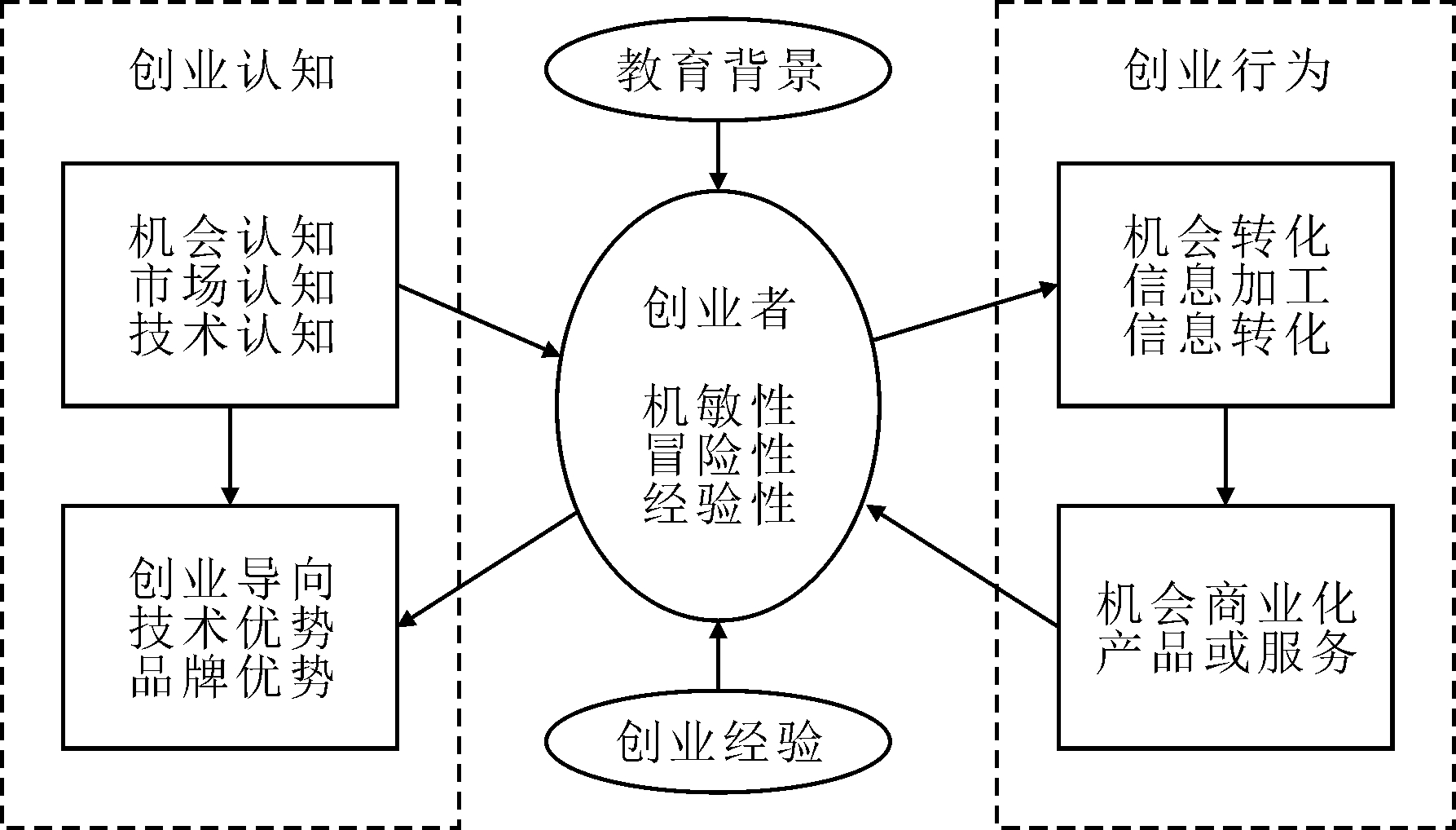 创业机会是创业活动的核心和基础,是指运用新手段完成新目标、引入新产品、新服务和新组织方式的可能性。创业机会识别包括创意产生、机会识别和机会评价3个过程。虽然,创业机会存在于客观环境中,但创业机会仍需要被创业者识别与发现[26],创业者对创业机会高效快速的识别能够迅速填补市场空缺,重塑市场均衡。创业机会识别与判断受制于创业者的信息处理与机会识别能力、认知推理能力、情绪等非理性因素以及决策标准等一系列认知能力[27]。因此,创业机会识别研究可以解决“为何创业者能够发现和识别潜在机会”、“创业者需要具备何种创业认知或知识经验结构才能够识别出现有资源、制度、环境下的创业机会”。