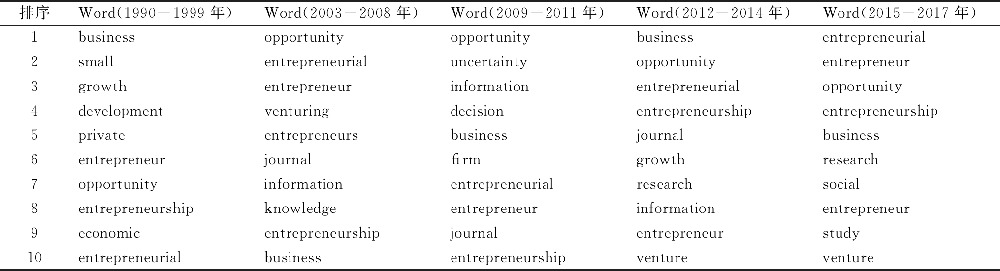 排序Word(1990-1999年)Word(2003-2008年)Word(2009-2011年)Word(2012-2014年)Word(2015-2017年)1businessopportunityopportunitybusinessentrepreneurial2smallentrepreneurialuncertaintyopportunityentrepreneur3growthentrepreneurinformationentrepreneurialopportunity4developmentventuringdecisionentrepreneurshipentrepreneurship5privateentrepreneursbusinessjournalbusiness6entrepreneurjournalrmgrowthresearch7opportunityinformationentrepreneurialresearchsocial8entrepreneurshipknowledgeentrepreneurinformationentrepreneur9economicentrepreneurshipjournalentrepreneurstudy10entrepreneurialbusinessentrepreneurshipventureventure