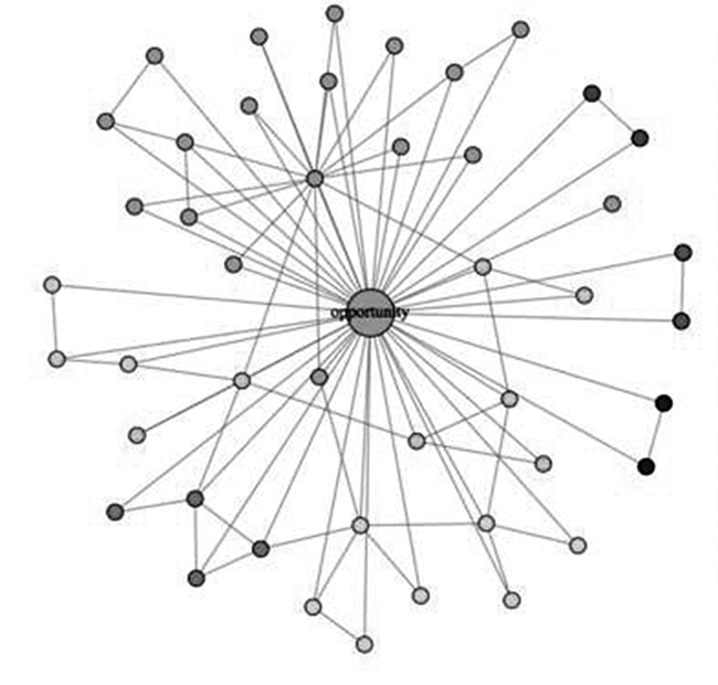 伴随着初创企业成长,创业者逐渐成长为企业家,其所呈现出的企业家精神的某些个性化特征影响创业过程中的行为决策理性,特别是机会识别与认知、机会转化和机会商业化过程。本文在上述研究的基础上,运用R 3.2.6软件对文献及关键词进行网络关联分析,见图9和图10。从中可见,所有文本围绕“机会”一词呈现出错综复杂的网络关系,在图10关键词网络关联中进一步体现了创业、认知、企业间的网络关系,特别是机会认知是创业机会转化及机会商业化全过程的开始,而其中企业家精神起到决定性作用。