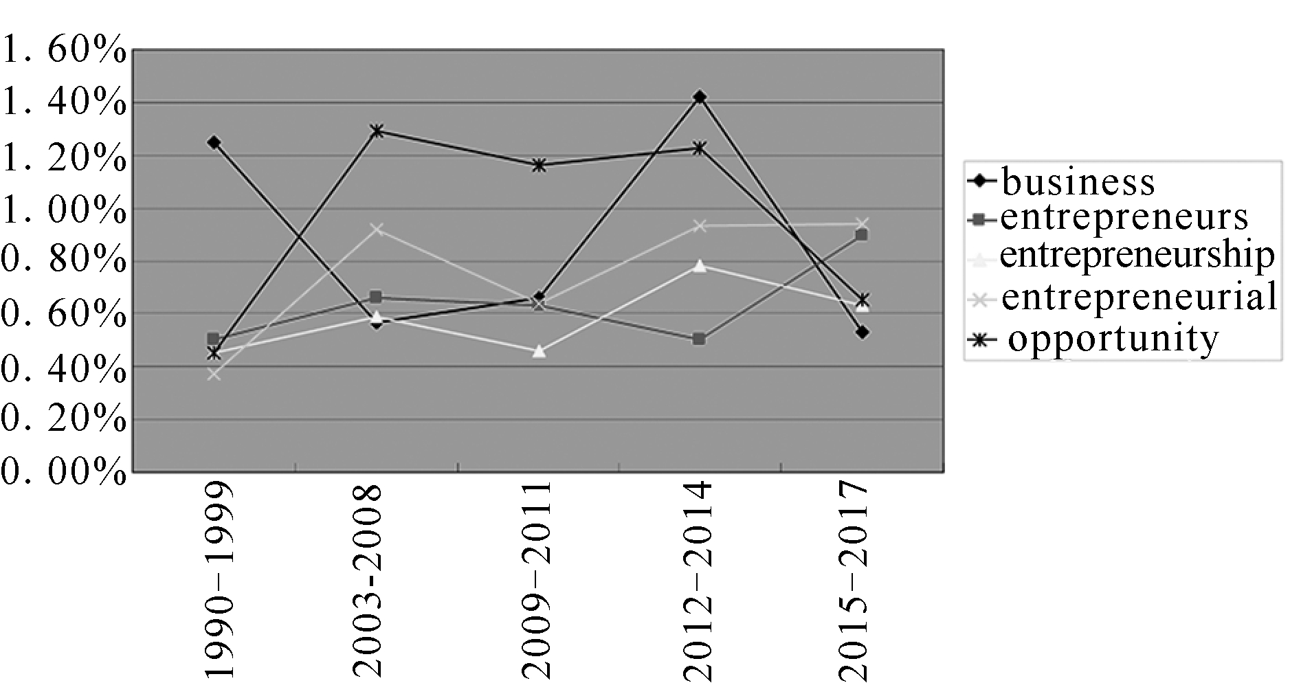 本文对各阶段词频排名位居前列的关键词“business”、“opportunity”、“entrepreneur”、“entrepreneurial”、“entrepreneurship”进行词频趋势分析,见图8。从中可见:首先,1999—2012年,“business”与“opportunity”两个关键词出现频率呈此消彼长、完全相反的趋势;其次,“entrepreneurial”和“entrepreneurship”全阶段时间跨度内呈现出完全一致的变化趋势;最后,“entrepreneur”和“entrepreneurial”在1990-2009年均势相同,而在2011-2017年趋势截然相反,特别是2009-2011年呈现出完全一致的频率。