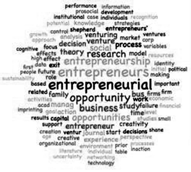 在对不同阶段文本进行分析的基础上,本文对各阶段文献进行关键词词频统计(见表1),虽然不同阶段关键词频排序呈现出较大的差异性,但各阶段排名靠前的关键词主要集中在“business”、“opportunity”、“entrepreneur”、“entrepreneurial”、“entrepreneurship”上。