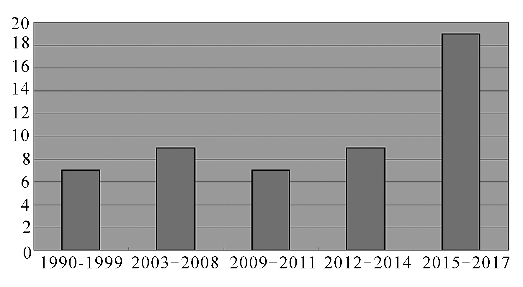本文对51篇文献在不同时期的分布数量和趋势进行描述性分析。首先,从1990-2017年文献发展趋势看,文献数量呈迅猛增长态势。1990-1999年共发表论文7篇,占总量的13.7%;2003-2008年涌现了9篇论文,占总量的17.6%;直至2015-2017年共发表论文19篇,占总量的37.3%,较上一阶段增长了近3倍,见图1。