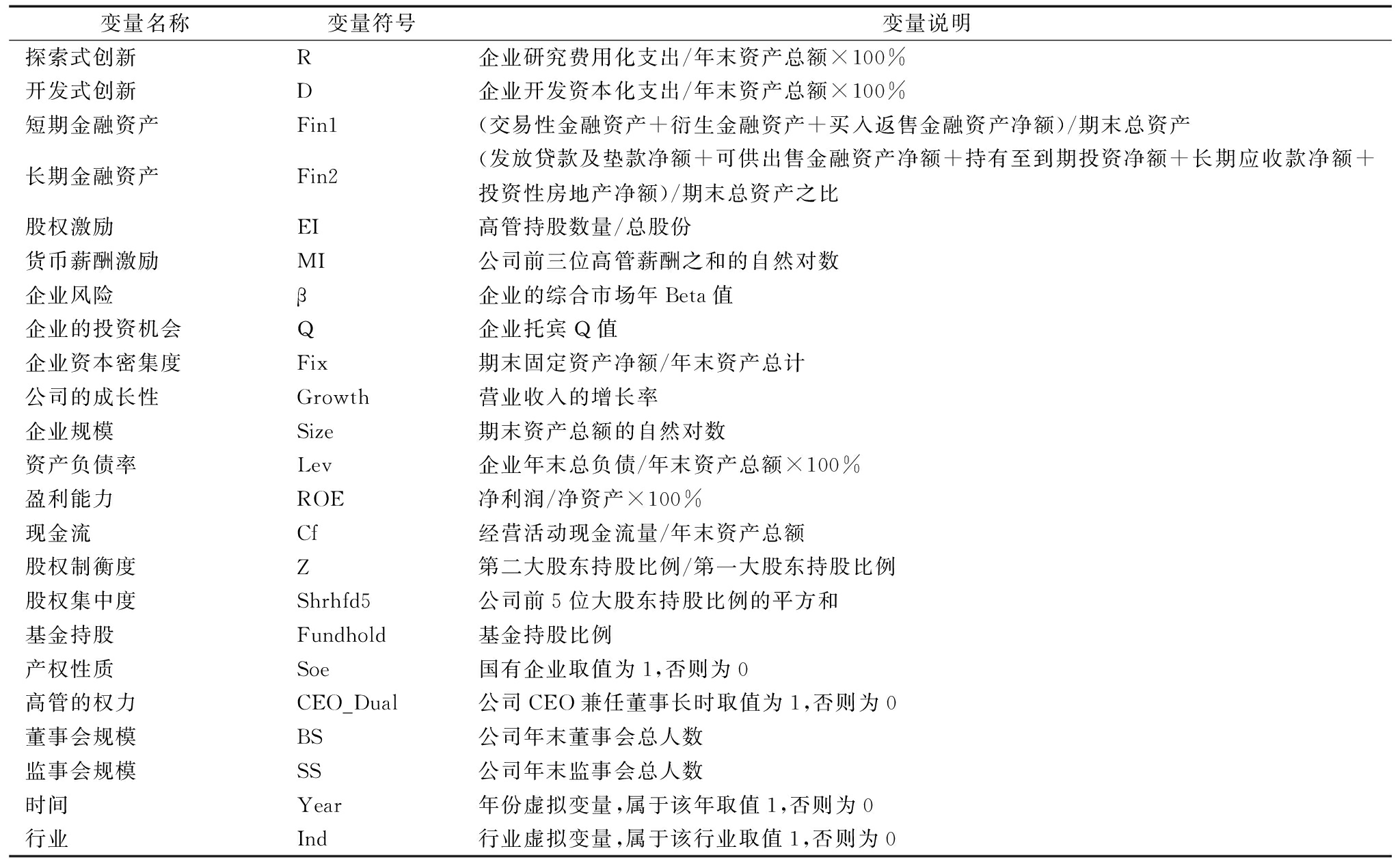 变量名称变量符号变量说明探索式创新R企业研究费用化支出/年末资产总额×100%开发式创新D企业开发资本化支出/年末资产总额×100%短期金融资产Fin1(交易性金融资产+衍生金融资产+买入返售金融资产净额)/期末总资产长期金融资产Fin2(发放贷款及垫款净额+可供出售金融资产净额+持有至到期投资净额+长期应收款净额+投资性房地产净额)/期末总资产之比股权激励EI高管持股数量/总股份货币薪酬激励MI公司前三位高管薪酬之和的自然对数企业风险β企业的综合市场年Beta值企业的投资机会Q企业托宾Q值企业资本密集度Fix期末固定资产净额/年末资产总计公司的成长性Growth营业收入的增长率企业规模Size期末资产总额的自然对数资产负债率Lev企业年末总负债/年末资产总额×100%盈利能力ROE净利润/净资产×100%现金流Cf经营活动现金流量/年末资产总额股权制衡度Z第二大股东持股比例/第一大股东持股比例股权集中度Shrhfd5公司前5位大股东持股比例的平方和基金持股Fundhold基金持股比例产权性质Soe国有企业取值为1,否则为0高管的权力CEO_Dual公司CEO兼任董事长时取值为1,否则为0董事会规模BS公司年末董事会总人数监事会规模SS公司年末监事会总人数时间Year年份虚拟变量,属于该年取值1,否则为0行业Ind行业虚拟变量,属于该行业取值1,否则为0
