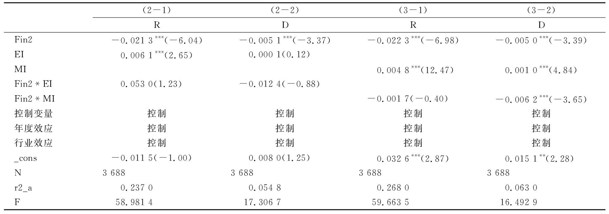 (2-1)(2-2)(3-1)(3-2)RDRDFin2-0.021 3***(-6.04)-0.005 1***(-3.37)-0.022 3***(-6.98)-0.005 0***(-3.39)EI0.006 1***(2.65)0.000 1(0.12)MI0.004 8***(12.47)0.001 0***(4.84)Fin2*EI0.053 0(1.23)-0.012 4(-0.88)Fin2*MI-0.001 7(-0.40)-0.006 2***(-3.65)控制变量控制控制控制控制年度效应控制控制控制控制行业效应控制控制控制控制_cons-0.011 5(-1.00)0.008 0(1.25)0.032 6***(2.87)0.015 1**(2.28)N3 688 3 6883 6883 688r2_a0.237 00.054 80.268 00.063 0F58.981 417.306 759.663 516.492 9