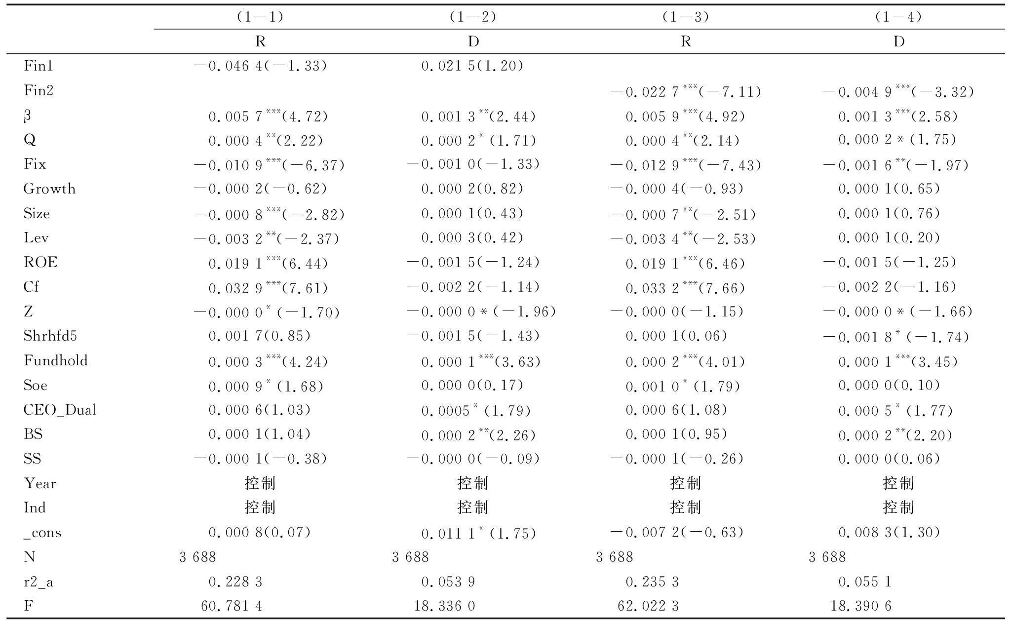 (1-1)(1-2)(1-3)(1-4)RDRDFin1-0.046 4(-1.33)0.021 5(1.20)Fin2-0.022 7***(-7.11)-0.004 9***(-3.32)β0.005 7***(4.72)0.001 3**(2.44)0.005 9***(4.92)0.001 3***(2.58)Q0.000 4**(2.22)0.000 2*(1.71)0.000 4**(2.14)0.000 2*(1.75)Fix-0.010 9***(-6.37)-0.001 0(-1.33)-0.012 9***(-7.43)-0.001 6**(-1.97)Growth-0.000 2(-0.62)0.000 2(0.82)-0.000 4(-0.93)0.000 1(0.65)Size-0.000 8***(-2.82)0.000 1(0.43)-0.000 7**(-2.51)0.000 1(0.76)Lev-0.003 2**(-2.37)0.000 3(0.42)-0.003 4**(-2.53)0.000 1(0.20)ROE0.019 1***(6.44)-0.001 5(-1.24)0.019 1***(6.46)-0.001 5(-1.25)Cf0.032 9***(7.61)-0.002 2(-1.14)0.033 2***(7.66)-0.002 2(-1.16)Z-0.000 0*(-1.70)-0.000 0*(-1.96)-0.000 0(-1.15)-0.000 0*(-1.66)Shrhfd50.001 7(0.85)-0.001 5(-1.43)0.000 1(0.06)-0.001 8*(-1.74)Fundhold0.000 3***(4.24)0.000 1***(3.63)0.000 2***(4.01)0.000 1***(3.45)Soe0.000 9*(1.68)0.000 0(0.17)0.001 0*(1.79)0.000 0(0.10)CEO_Dual0.000 6(1.03)0.0005*(1.79)0.000 6(1.08)0.000 5*(1.77)BS0.000 1(1.04)0.000 2**(2.26)0.000 1(0.95)0.000 2**(2.20)SS-0.000 1(-0.38)-0.000 0(-0.09)-0.000 1(-0.26)0.000 0(0.06)Year控制控制控制控制Ind控制控制控制控制_cons0.000 8(0.07)0.011 1*(1.75)-0.007 2(-0.63)0.008 3(1.30)N 3 6883 6883 6883 688r2_a0.228 30.053 90.235 30.055 1F60.781 418.336 062.022 318.390 6