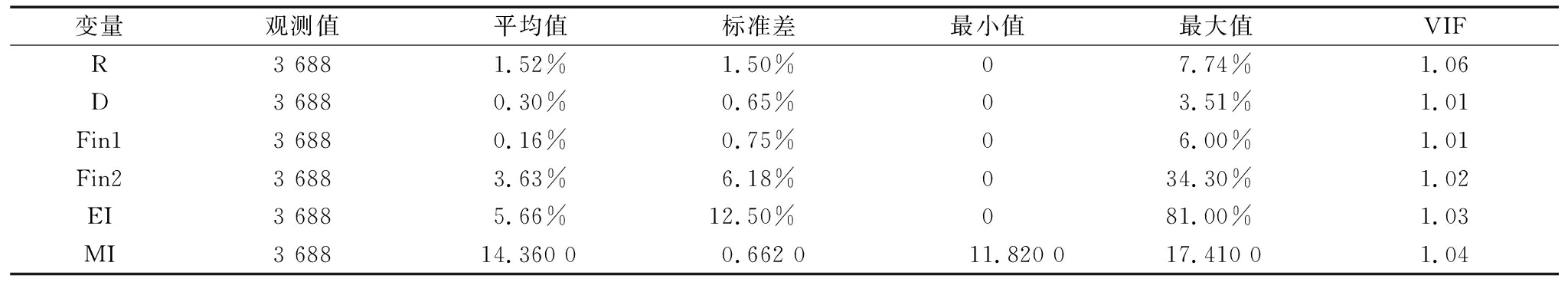 变量观测值平均值标准差最小值最大值VIFR3 6881.52%1.50%07.74% 1.06D3 6880.30%0.65%03.51% 1.01Fin13 6880.16%0.75%06.00% 1.01Fin23 6883.63%6.18%034.30% 1.02EI3 6885.66%12.50%081.00% 1.03MI3 68814.360 00.662 011.820 017.410 0 1.04