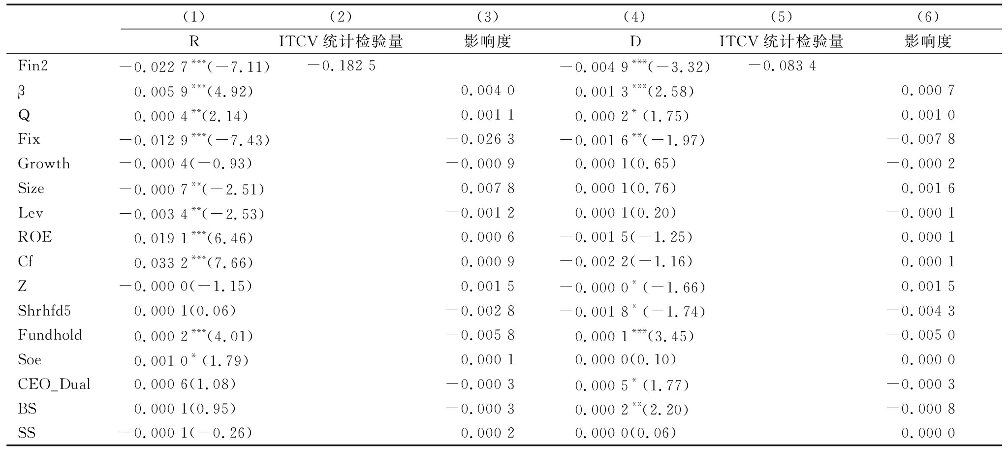 (1)(2)(3)(4)(5)(6)RITCV统计检验量影响度DITCV统计检验量影响度Fin2-0.022 7***(-7.11)-0.182 5-0.004 9***(-3.32)-0.083 4β0.005 9***(4.92)0.004 00.001 3***(2.58)0.000 7Q0.000 4**(2.14)0.001 10.000 2*(1.75)0.001 0Fix-0.012 9***(-7.43)-0.026 3-0.001 6**(-1.97)-0.007 8Growth-0.000 4(-0.93)-0.000 90.000 1(0.65)-0.000 2Size-0.000 7**(-2.51)0.007 80.000 1(0.76)0.001 6Lev-0.003 4**(-2.53)-0.001 20.000 1(0.20)-0.000 1ROE0.019 1***(6.46)0.000 6-0.001 5(-1.25)0.000 1Cf0.033 2***(7.66)0.000 9-0.002 2(-1.16)0.000 1Z-0.000 0(-1.15)0.001 5-0.000 0*(-1.66)0.001 5Shrhfd50.000 1(0.06)-0.002 8-0.001 8*(-1.74)-0.004 3Fundhold0.000 2***(4.01)-0.005 80.000 1***(3.45)-0.005 0Soe0.001 0*(1.79)0.000 10.000 0(0.10)0.000 0CEO_Dual0.000 6(1.08)-0.000 30.000 5*(1.77)-0.000 3BS0.000 1(0.95)-0.000 30.000 2**(2.20)-0.000 8SS-0.000 1(-0.26)0.000 20.000 0(0.06)0.000 0
