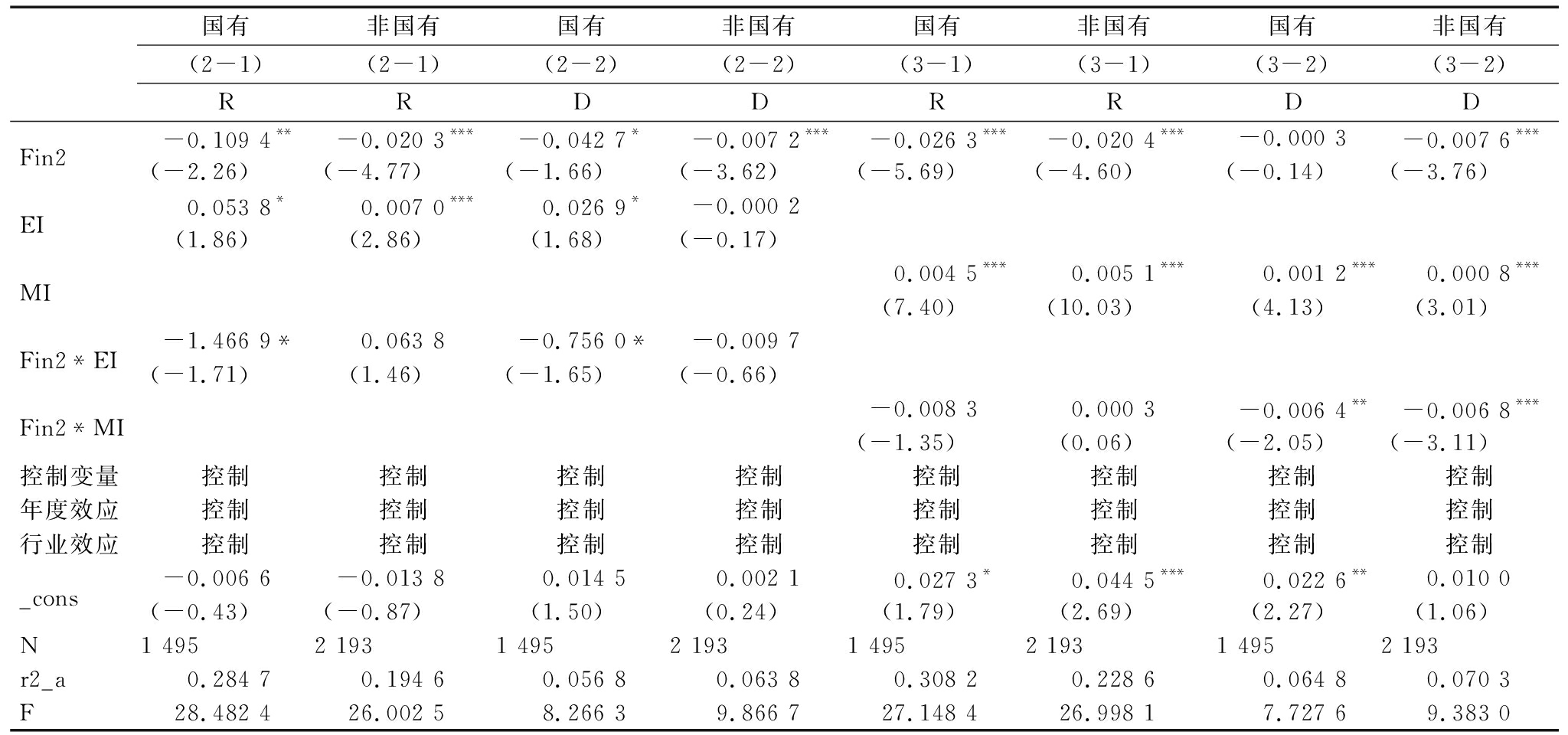 国有非国有国有非国有国有非国有国有非国有(2-1)(2-1)(2-2)(2-2)(3-1)(3-1)(3-2)(3-2)RRDDRRDDFin2-0.109 4**-0.020 3***-0.042 7*-0.007 2***-0.026 3***-0.020 4***-0.000 3-0.007 6***(-2.26)(-4.77)(-1.66)(-3.62)(-5.69)(-4.60)(-0.14)(-3.76)EI0.053 8*0.007 0***0.026 9*-0.000 2(1.86)(2.86)(1.68)(-0.17)MI0.004 5***0.005 1***0.001 2***0.000 8***(7.40)(10.03)(4.13)(3.01)Fin2*EI-1.466 9*0.063 8-0.756 0*-0.009 7(-1.71)(1.46)(-1.65)(-0.66)Fin2*MI-0.008 30.000 3-0.006 4**-0.006 8***(-1.35)(0.06)(-2.05)(-3.11)控制变量控制控制控制控制控制控制控制控制年度效应控制控制控制控制控制控制控制控制行业效应控制控制控制控制控制控制控制控制_cons-0.006 6-0.013 80.014 50.002 10.027 3*0.044 5***0.022 6**0.010 0(-0.43)(-0.87)(1.50)(0.24)(1.79)(2.69)(2.27)(1.06)N1 4952 1931 4952 1931 4952 1931 4952 193r2_a0.284 70.194 60.056 80.063 80.308 20.228 60.064 80.070 3F28.482 426.002 58.266 39.866 727.148 426.998 17.727 69.383 0