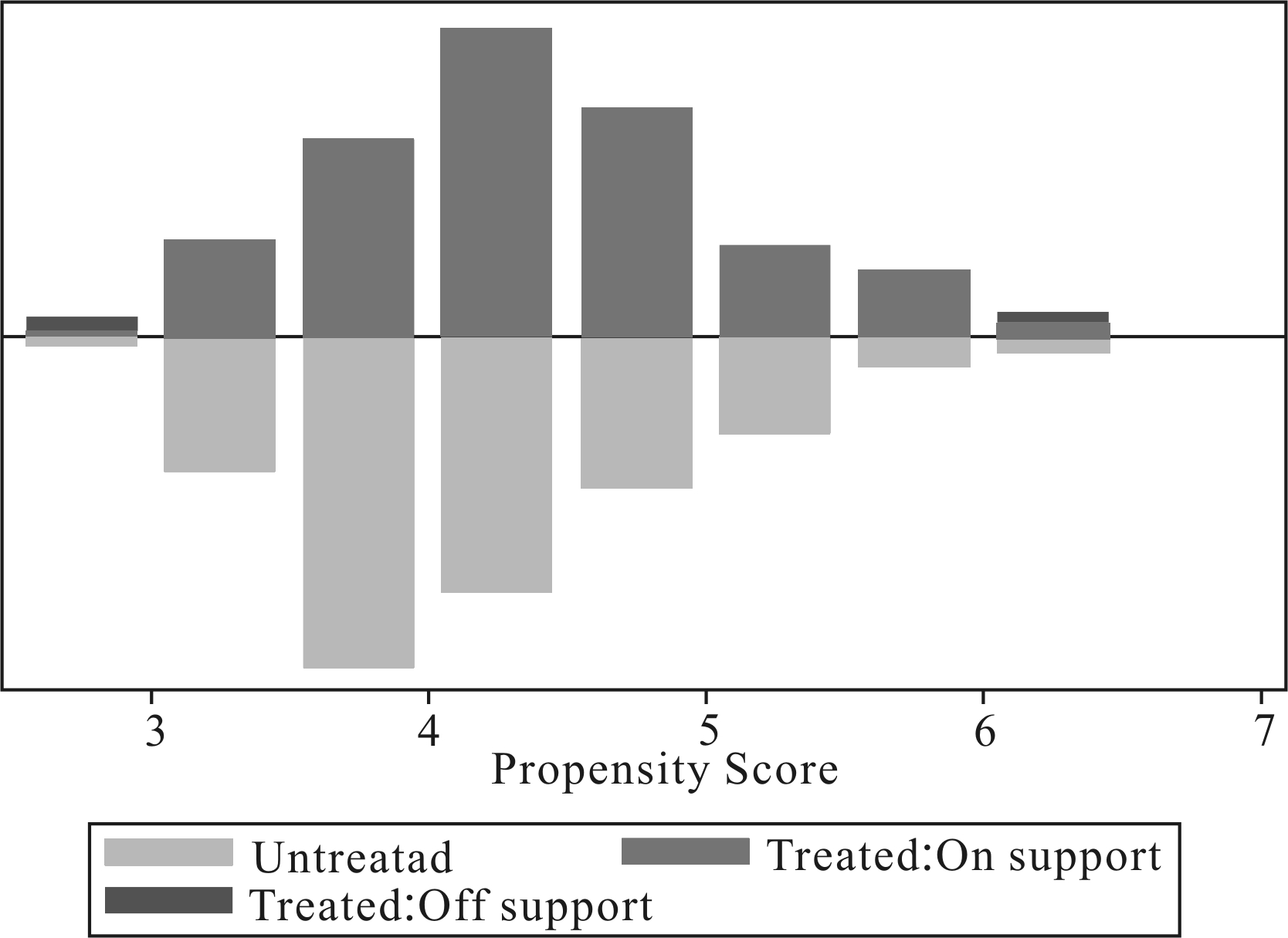 然而,PSM-DID只有通过平衡性检验和共同支撑检验才能准确地估计政策效应。为此,本文首先对匹配质量进行统计检验。平衡性检验是指,在条件外生假设前提下,所有协变量的倾向得分在处理组和控制组之间没有系统性差异,此时称其为平衡。本文分别对处理组和控制组协变量匹配前后的差异进行检验,见表10。从平衡性检验结果看,在进行匹配后,处理组和控制组的协变量已基本平衡,所有变量标准化偏差小于10%。对比匹配前的结果,除产业结构外,其它变量的标准化偏差均明显缩小,表明匹配提高了处理组与控制组的可比性。