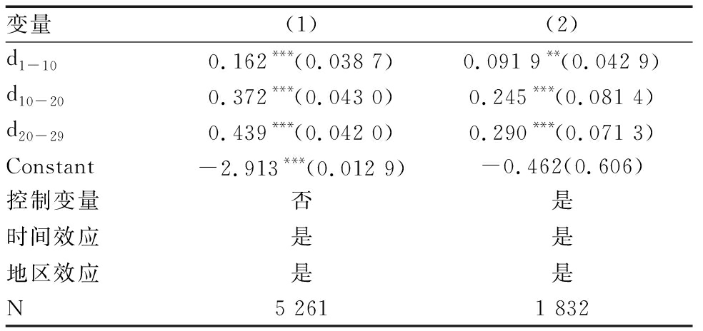 变量(1)(2)d1-100.162***(0.038 7)0.091 9**(0.042 9)d10-200.372***(0.043 0)0.245***(0.081 4)d20-290.439***(0.042 0)0.290***(0.071 3)Constant-2.913***(0.012 9)-0.462(0.606)控制变量时间效应地区效应否是是是是是N5 2611 832