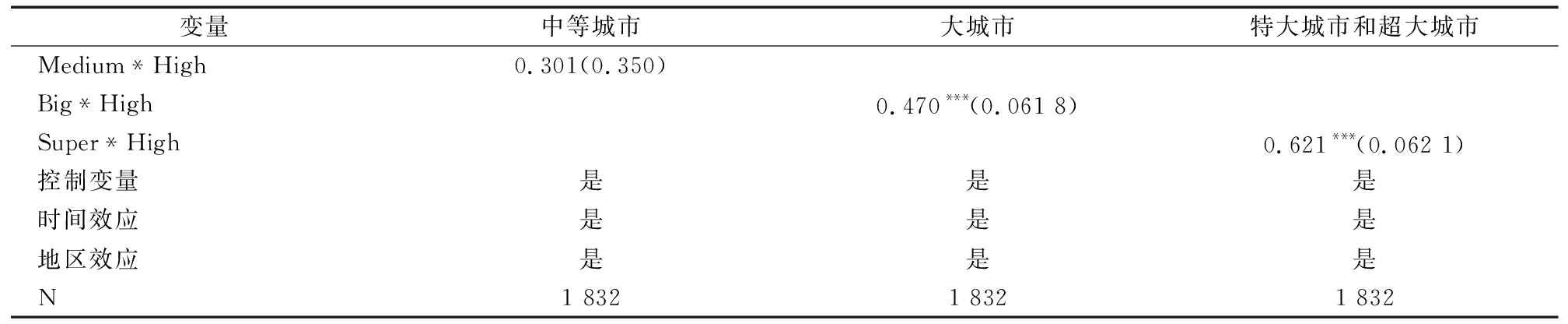 变量中等城市大城市特大城市和超大城市Medium*High0.301(0.350)Big*High0.470***(0.061 8)Super*High0.621***(0.062 1)控制变量时间效应地区效应是是是是是是是是是N1 8321 8321 832