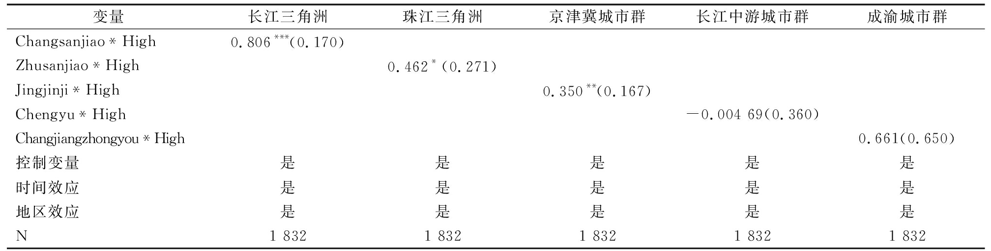 变量长江三角洲珠江三角洲京津冀城市群长江中游城市群成渝城市群Changsanjiao*High0.806***(0.170)Zhusanjiao*High0.462*(0.271)Jingjinji*High0.350**(0.167)Chengyu*High-0.004 69(0.360)Changjiangzhongyou*High0.661(0.650)控制变量时间效应是是是是是是是是是是地区效应是是是是是N1 8321 8321 8321 8321 832