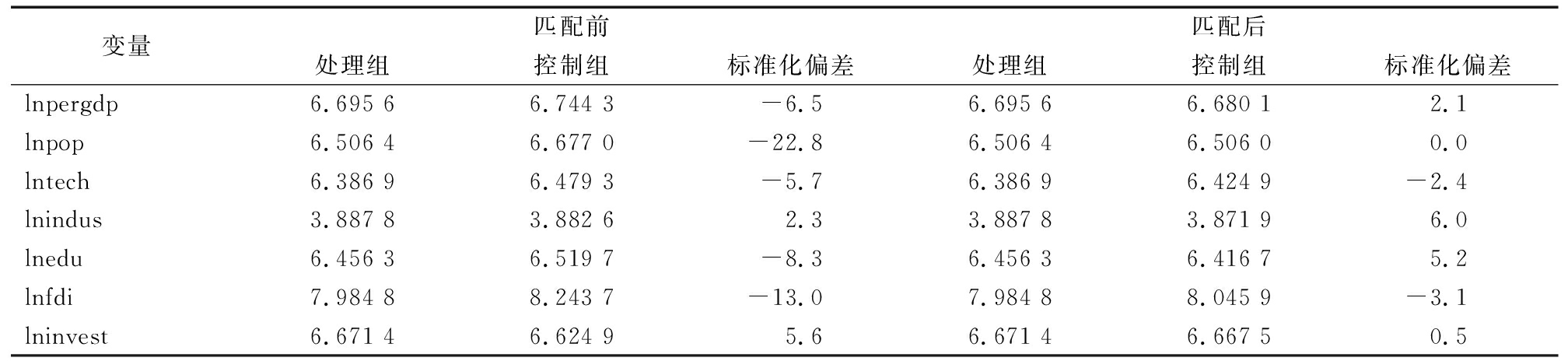 变量匹配前匹配后处理组控制组标准化偏差处理组控制组标准化偏差lnpergdp6.695 66.744 3-6.56.695 66.680 12.1lnpop6.506 46.677 0-22.86.506 46.506 00.0lntech6.386 96.479 3-5.76.386 96.424 9-2.4lnindus3.887 83.882 62.33.887 83.871 96.0lnedu6.456 36.519 7-8.36.456 36.416 75.2lnfdi7.984 88.243 7-13.07.984 88.045 9-3.1lninvest6.671 46.624 95.66.671 46.667 50.5