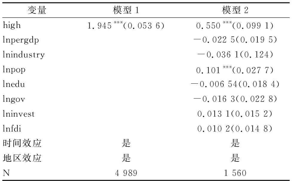 变量模型1模型2high1.945***(0.053 6)0.550***(0.099 1)lnpergdp-0.022 5(0.019 5)lnindustry-0.036 1(0.124)lnpop0.101***(0.027 7)lnedu-0.006 54(0.018 4)lngov-0.016 3(0.022 8)lninvest0.013 1(0.015 2)lnfdi0.010 2(0.014 8)时间效应是是地区效应是是N4 9891 560