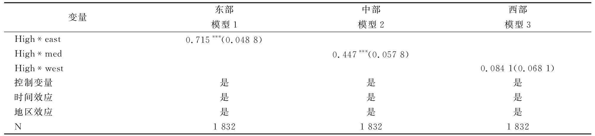变量东部模型1中部模型2西部模型3High*east0.715***(0.048 8)High*med0.447***(0.057 8)High*west0.084 1(0.068 1)控制变量是是是时间效应是是是地区效应是是是N1 8321 8321 832