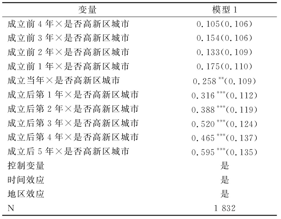 变量模型1成立前4年×是否高新区城市0.105(0.106)成立前3年×是否高新区城市0.154(0.106)成立前2年×是否高新区城市0.133(0.109)成立前1年×是否高新区城市0.175(0.110)成立当年×是否高新区城市0.258**(0.109)成立后第1年×是否高新区城市0.316***(0.112)成立后第2年×是否高新区城市0.388***(0.119)成立后第3年×是否高新区城市0.520***(0.124)成立后第4年×是否高新区城市0.465***(0.137)成立后5年×是否高新区城市0.595***(0.135)控制变量是时间效应是地区效应是N1 832