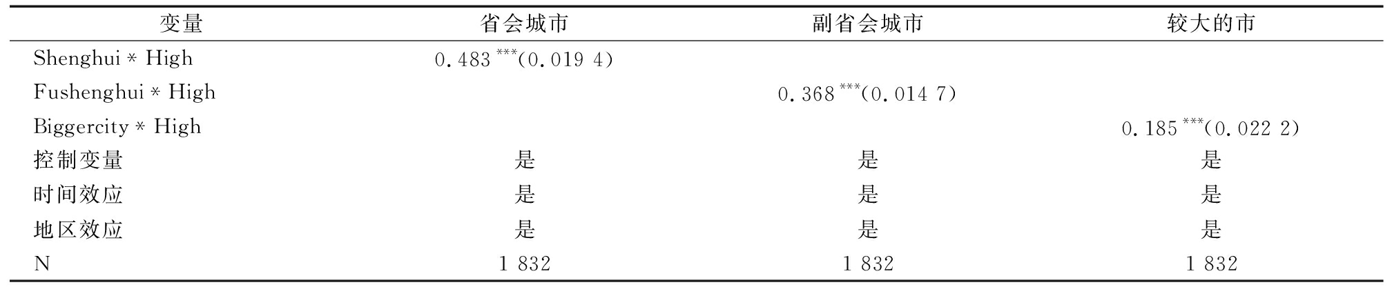 变量省会城市副省会城市较大的市Shenghui*High0.483***(0.019 4)Fushenghui*High0.368***(0.014 7)Biggercity*High0.185***(0.022 2)控制变量时间效应地区效应是是是是是是是是是N1 8321 8321 832