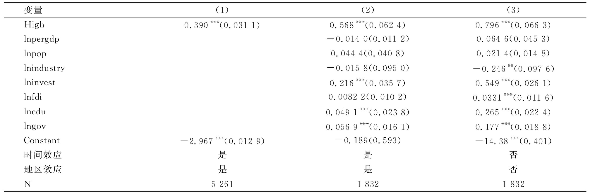 变量(1)(2)(3)High0.390***(0.031 1)0.568***(0.062 4)0.796***(0.066 3)lnpergdp-0.014 0(0.011 2)0.064 6(0.045 3)lnpop0.044 4(0.040 8)0.021 4(0.014 8)lnindustry-0.015 8(0.095 0)-0.246**(0.097 6)lninvest0.216***(0.035 7)0.549***(0.026 1)lnfdi0.0082 2(0.010 2)0.0331***(0.011 6)lnedu0.049 1***(0.023 8)0.265***(0.022 4)lngov0.056 9***(0.016 1)0.177***(0.018 8)Constant-2.967***(0.012 9)-0.189(0.593)-14.38***(0.401)时间效应是是否地区效应是是否N5 2611 8321 832