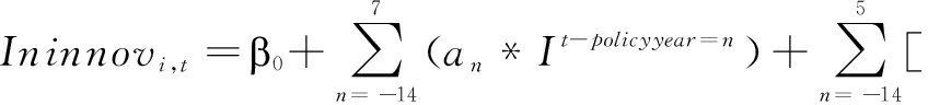 式(6)中,It-policyyear=n的取值方式为,当t-policyyear=n时,It-policyyear=n取值为1,否则为0;policyyear表示各城市高新区成立年份;Treat为是否是高新区城市,将2016年之前设立高新区的城市认定为高新区城市,即Treat=1。样本中,最早成立的一批高新区是在2007年,最晚的一批是在2016年。因此得到高新区成立之前第15年和成立之后第9年的城市;n的可能取值为-15,-14,-13,……,0,8,9,为了避免多重共线性,本文将t-policyyear=-15,-14,-13,-12,-11,-10,-9,-8,-7,-6归并到-5,将t-policyyear=6,7,8,9合并到5,并以n=-5为基准组。