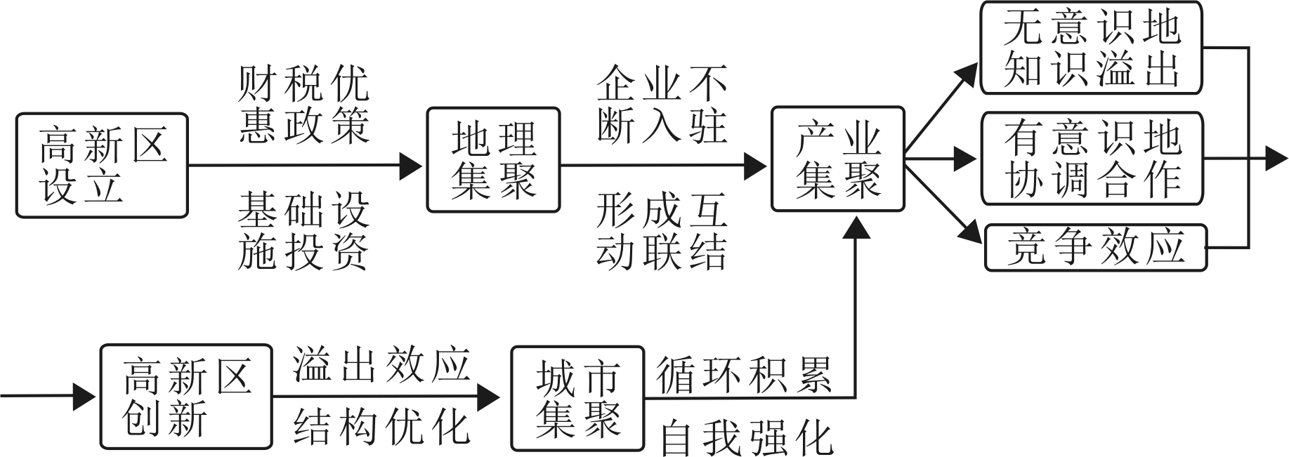 已有学者对开发区集聚效应展开研究[4,5]。郑江淮等[6]认为,企业入驻高新区是为了获得“政策租”,因此高新区企业聚集并不会产生通常认为的产业集聚效应,也不能享受靠近要素或市场的好处。然而,企业一旦“落地”开发区,出于技术升级和改造需求,其技术和市场行为必将与当地政府和产业关联要素发生作用,集聚效应逐步体现,最终发展成各具特点的产业集群。