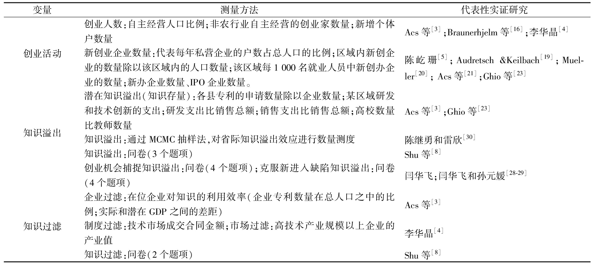 现有研究对核心变量——知识过滤、知识溢出和创业活动的测量多以间接代理变量为主,数据来源主要是各个国家或地区的数据库,常见的有OECD国家数据库、《GEM中国及全球报告》、《中国经济普查年鉴》、《中国统计年鉴》和《中国科技统计年鉴》等数据库。目前,有小部分实证研究已经开始以问卷调研方式测量核心变量,如闫华飞、闫华飞和孙元媛以及Shu等的研究成果。具体来看,表2归纳了现有KSTE研究对核心变量的主要测量方式。如表2所示,对于创业活动、知识溢出和知识过滤,现有文献分别利用多个代理变量,且多依赖于二手数据源进行测量。