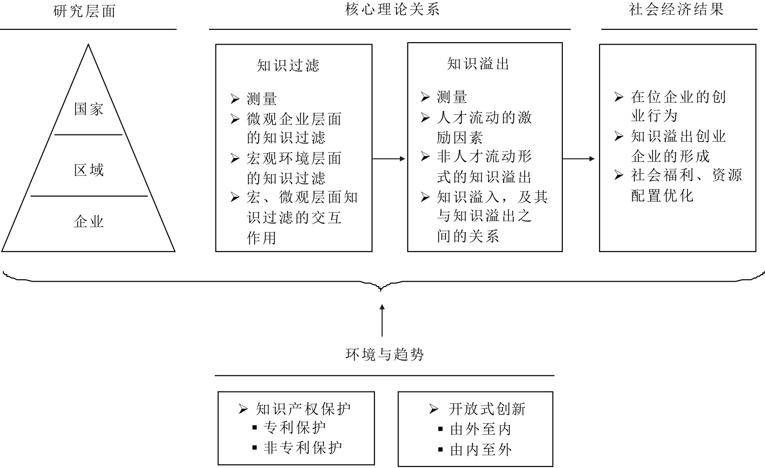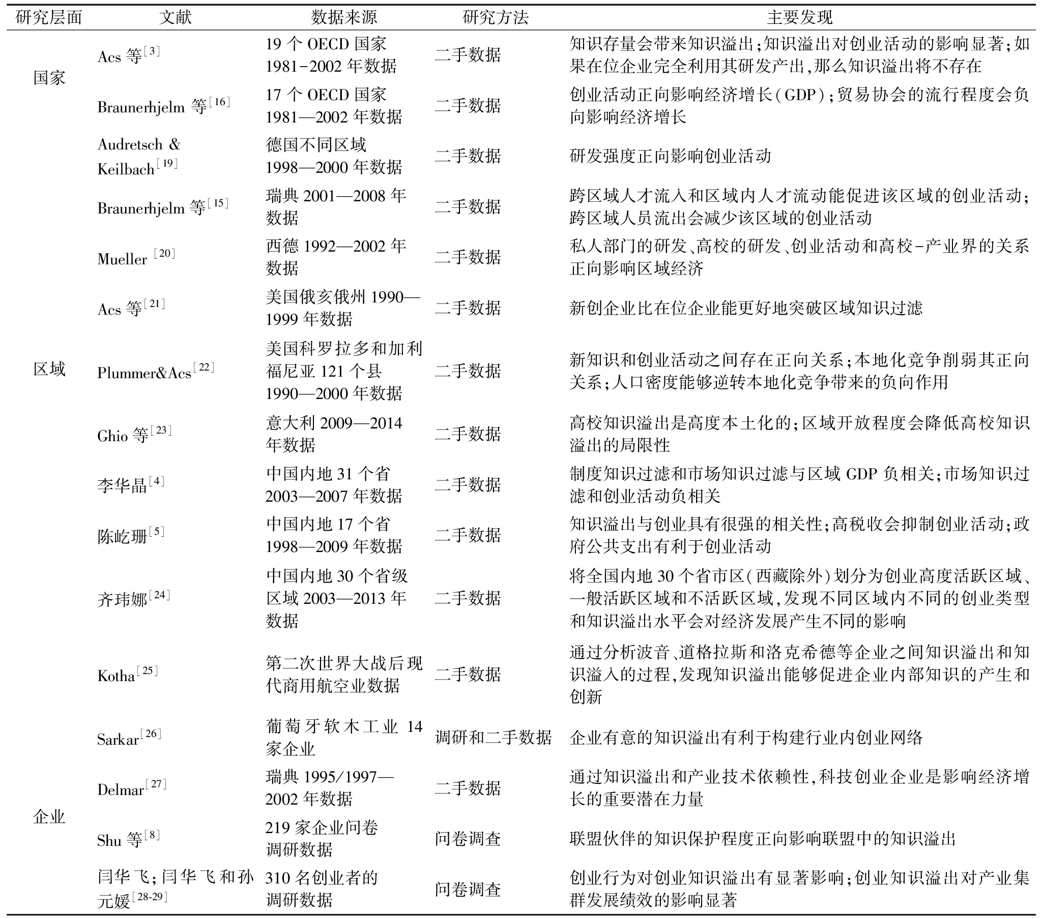 (1)国家层面:既有实证研究主要探讨了知识存量—知识溢出—创业活动之间的关系以及这一关系的影响因素。所得结论主要包括:知识存量正向影响知识溢出,而知识溢出又能促进创业活动。