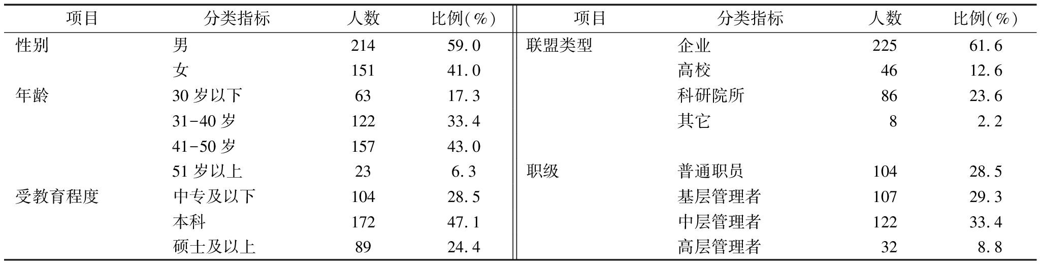 项目 分类指标人数比例(%)项目分类指标人数比例(%)性别男21459.0联盟类型企业22561.6女15141.0高校4612.6年龄30岁以下6317.3科研院所8623.631-40岁12233.4其它82.241-50岁15743.051岁以上236.3职级普通职员10428.5受教育程度中专及以下10428.5基层管理者10729.3本科17247.1中层管理者12233.4硕士及以上8924.4高层管理者328.8