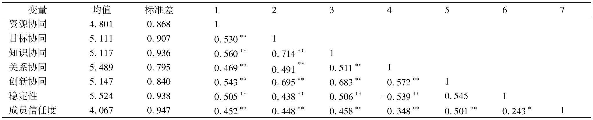 变量均值标准差1234567资源协同4.8010.8681目标协同5.1110.9070.530∗∗1知识协同5.1170.9360.560∗∗0.714∗∗1关系协同5.4890.7950.469∗∗0.491∗∗0.511∗∗1创新协同5.1470.8400.543∗∗0.695∗∗0.683∗∗0.572∗∗1稳定性5.5240.9380.505∗∗0.438∗∗0.506∗∗-0.539∗∗0.5451成员信任度4.0670.9470.452∗∗0.448∗∗0.458∗∗0.348∗∗0.501∗∗0.243∗1