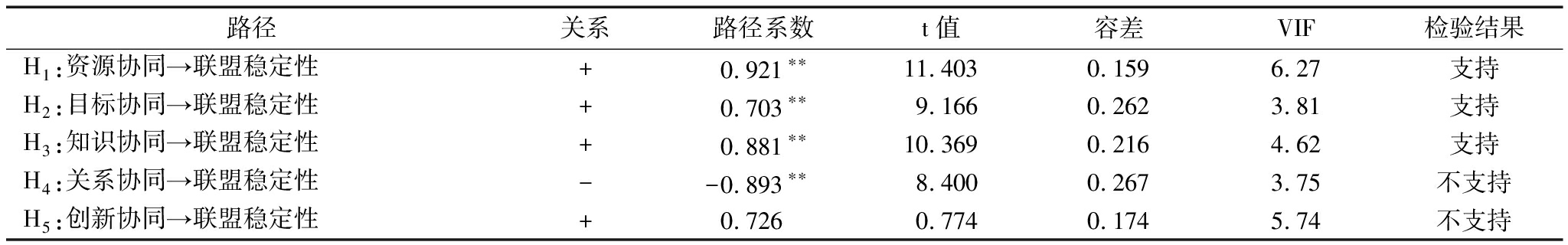 路径关系路径系数t值容差VIF检验结果H1:资源协同→联盟稳定性 +0.921∗∗11.4030.1596.27支持H2:目标协同→联盟稳定性 +0.703∗∗9.1660.2623.81支持H3:知识协同→联盟稳定性 +0.881∗∗10.3690.2164.62支持H4:关系协同→联盟稳定性 --0.893∗∗8.4000.2673.75不支持H5:创新协同→联盟稳定性 +0.7260.7740.1745.74不支持