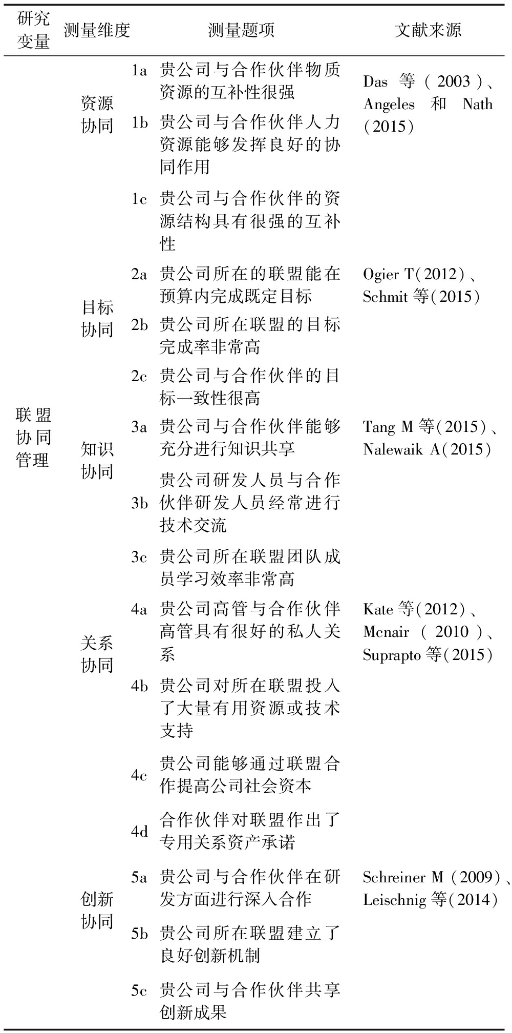 研究变量测量维度测量题项文献来源资源协同1a贵公司与合作伙伴物质资源的互补性很强Das等(2003)、Angeles和Nath(2015)1b贵公司与合作伙伴人力资源能够发挥良好的协同作用1c贵公司与合作伙伴的资源结构具有很强的互补性目标协同2a贵公司所在的联盟能在预算内完成既定目标Ogier T(2012)、Schmit等(2015)2b贵公司所在联盟的目标完成率非常高2c贵公司与合作伙伴的目标一致性很高联盟协同管理知识协同3a贵公司与合作伙伴能够充分进行知识共享Tang M等(2015)、Nalewaik A(2015)3b贵公司研发人员与合作伙伴研发人员经常进行技术交流3c贵公司所在联盟团队成员学习效率非常高关系协同4a贵公司高管与合作伙伴高管具有很好的私人关系Kate等(2012)、Mcnair(2010)、Suprapto等(2015)4b贵公司对所在联盟投入了大量有用资源或技术支持4c贵公司能够通过联盟合作提高公司社会资本4d合作伙伴对联盟作出了专用关系资产承诺创新协同5a贵公司与合作伙伴在研发方面进行深入合作Schreiner M (2009)、Leischnig等(2014)5b贵公司所在联盟建立了良好创新机制5c贵公司与合作伙伴共享创新成果
