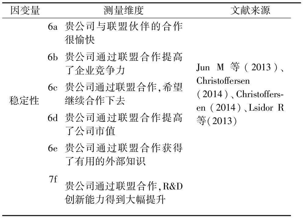 本研究以联盟稳定性为因变量,在梳理相关文献的基础上,构建联盟稳定性的测量量表,如表2所示。
