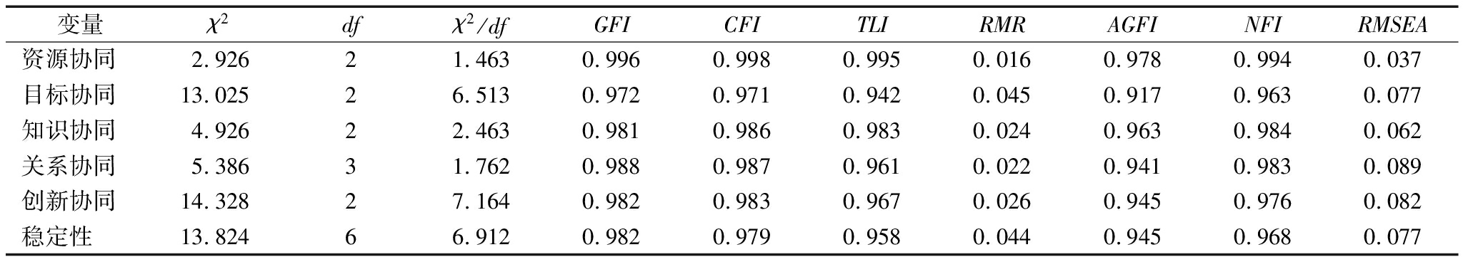 采用验证性因子分析法验证研究变量的收敛效度,分别对资源协同、目标协同、知识协同、关系协同、创新协同和稳定性进行验证性因子分析。表6中变量测量条目在相应因子上的标准化载荷均高于0.5,从模型拟合效果看,绝大部分拟合指标达到可接受标准,表明模型可以接受,具有良好收敛效度。