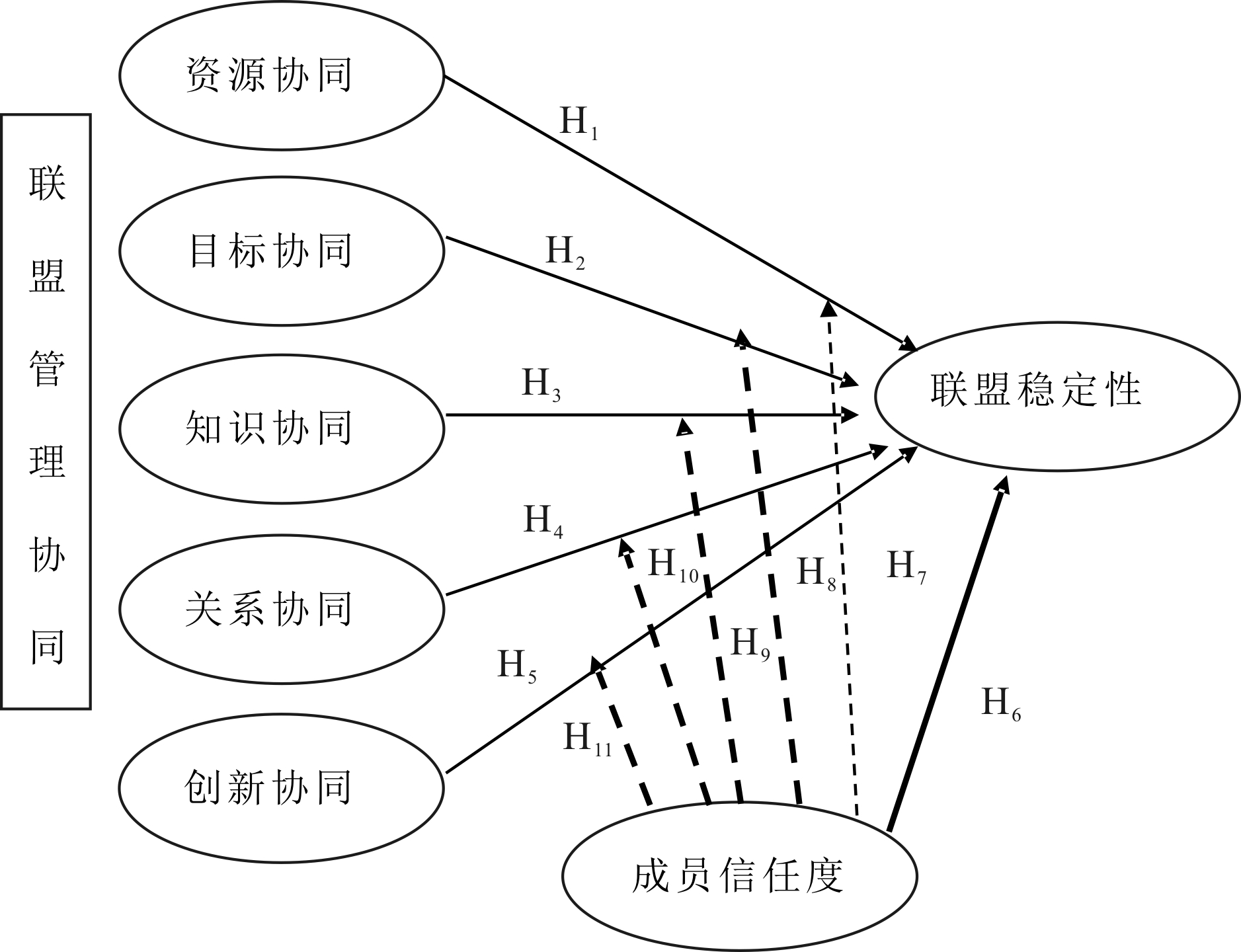 H11:成员信任度在创新协同与联盟稳定性之间存在调节作用。