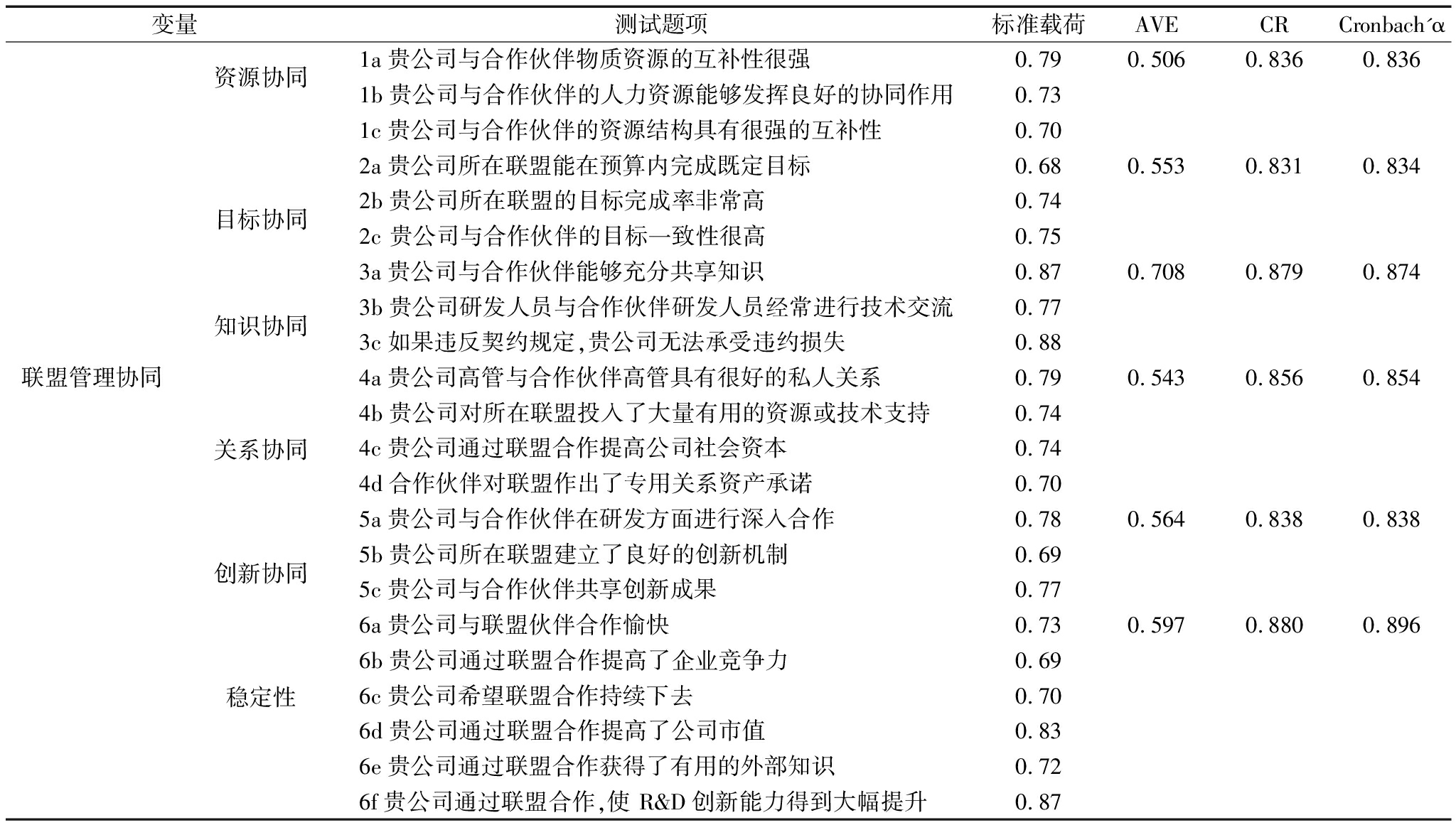 变量测试题项标准载荷AVECRCronbach'α 资源协同1a贵公司与合作伙伴物质资源的互补性很强0.790.5060.8360.8361b贵公司与合作伙伴的人力资源能够发挥良好的协同作用0.731c贵公司与合作伙伴的资源结构具有很强的互补性0.70目标协同2a贵公司所在联盟能在预算内完成既定目标0.680.553 0.8310.8342b贵公司所在联盟的目标完成率非常高0.742c 贵公司与合作伙伴的目标一致性很高0.75知识协同3a贵公司与合作伙伴能够充分共享知识0.870.7080.8790.8743b贵公司研发人员与合作伙伴研发人员经常进行技术交流0.773c如果违反契约规定,贵公司无法承受违约损失0.88联盟管理协同关系协同4a贵公司高管与合作伙伴高管具有很好的私人关系0.790.5430.8560.8544b贵公司对所在联盟投入了大量有用的资源或技术支持0.744c贵公司通过联盟合作提高公司社会资本0.744d合作伙伴对联盟作出了专用关系资产承诺0.70创新协同5a贵公司与合作伙伴在研发方面进行深入合作0.780.5640.8380.8385b贵公司所在联盟建立了良好的创新机制0.695c贵公司与合作伙伴共享创新成果0.77稳定性6a贵公司与联盟伙伴合作愉快0.730.5970.8800.8966b贵公司通过联盟合作提高了企业竞争力0.696c贵公司希望联盟合作持续下去0.706d贵公司通过联盟合作提高了公司市值0.836e贵公司通过联盟合作获得了有用的外部知识0.726f贵公司通过联盟合作,使 R&D创新能力得到大幅提升0.87
