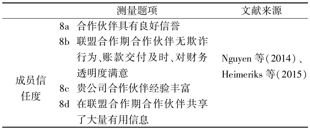 测量题项文献来源8a合作伙伴具有良好信誉Nguyen等(2014)、Heimeriks等(2015)8b联盟合作期合作伙伴无欺诈行为、账款交付及时、对财务透明度满意成员信任度8c贵公司合作伙伴经验丰富8d在联盟合作期合作伙伴共享了大量有用信息