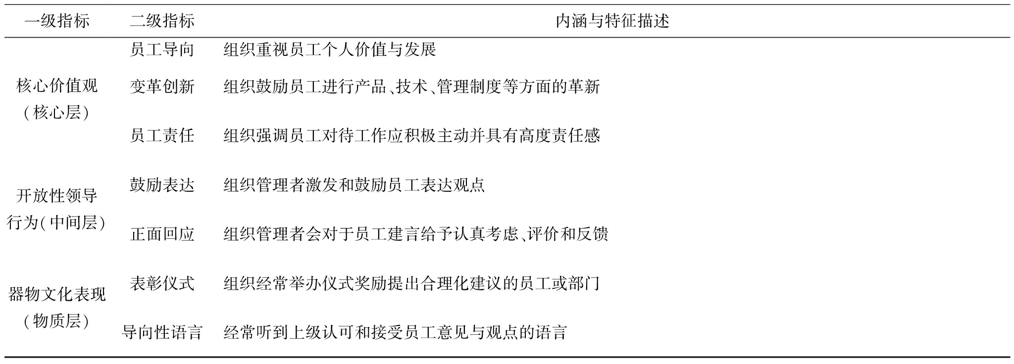 一级指标二级指标内涵与特征描述核心价值观(核心层)员工导向组织重视员工个人价值与发展变革创新组织鼓励员工进行产品、技术、管理制度等方面的革新员工责任组织强调员工对待工作应积极主动并具有高度责任感开放性领导行为(中间层)鼓励表达组织管理者激发和鼓励员工表达观点正面回应组织管理者会对于员工建言给予认真考虑、评价和反馈器物文化表现(物质层)表彰仪式组织经常举办仪式奖励提出合理化建议的员工或部门导向性语言经常听到上级认可和接受员工意见与观点的语言