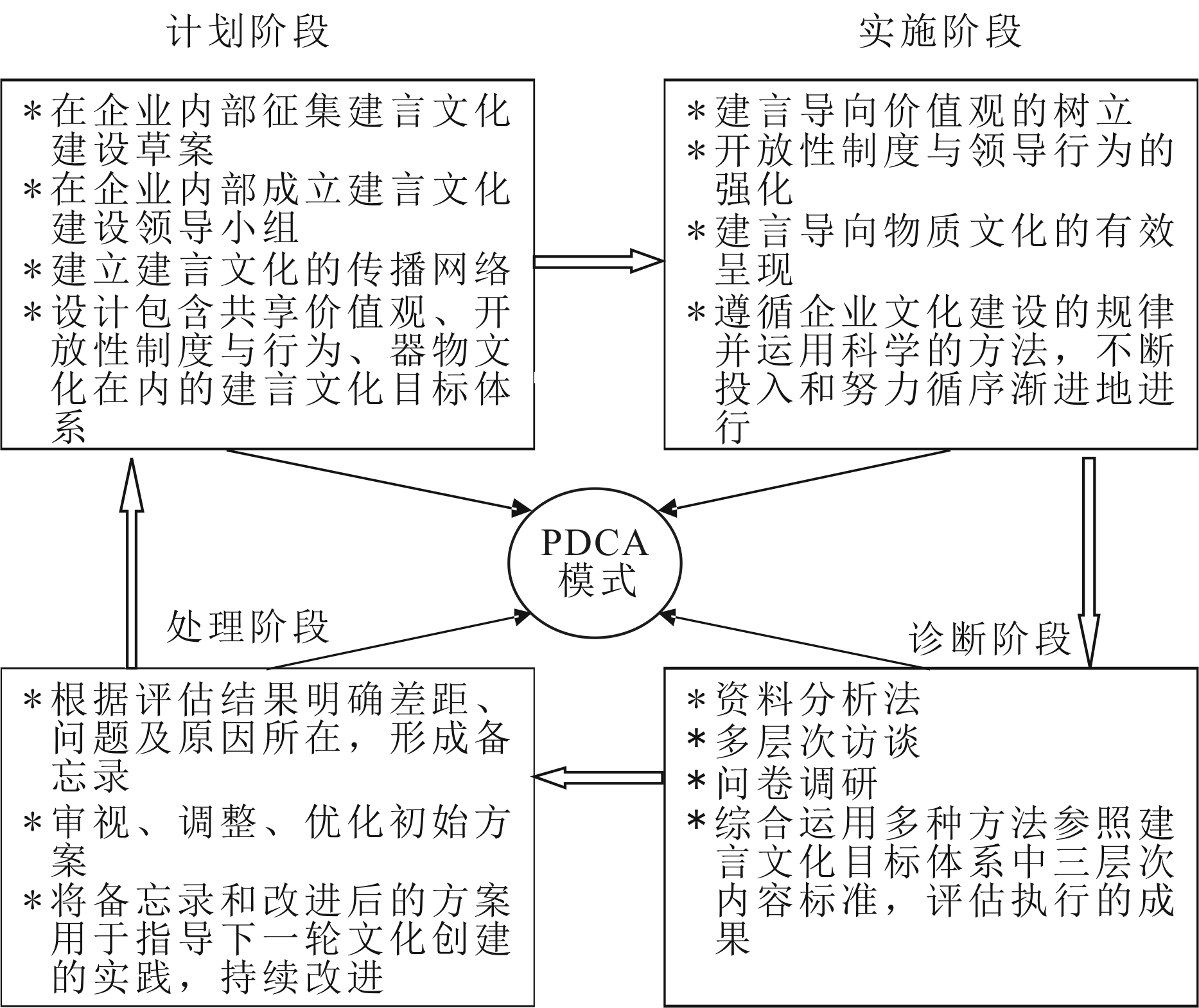 中国特色传统文化在中国人性格和心理上留下的深刻烙印,使得中国企业在倡导开放创新、员工导向和责任承担价值导向的过程中步履艰难。然而,随着现代化进程加快,以人为本、员工-组织目标共同体等理念的提出与践行,以及组织结构扁平化变革趋势,为中国企业营造平等趋向、开放自由、支持表达的文化氛围提供了可行性前提和实践基础。先进的企业文化建设是一个持续更新改进的循环过程,PDCA法则在企业管理中的广泛应用,证明其是对持续改进、螺旋上升规律的科学总结[30],可应用于包括建言文化在内的文化建设工作之中。本研究参考PDCA循环管理法则,得到建言文化创建流程和路径,如图1所示。