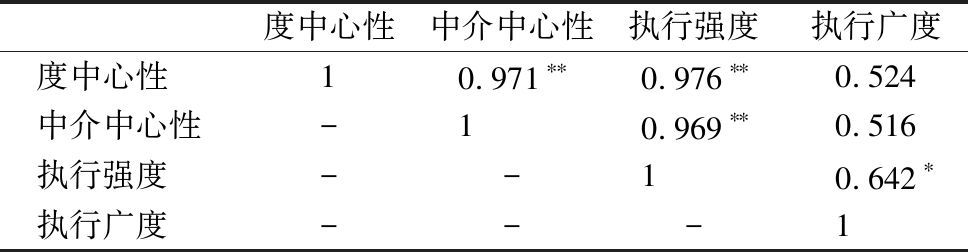 表5 北京市政策主体网络结构特征与执行特征相关性分析