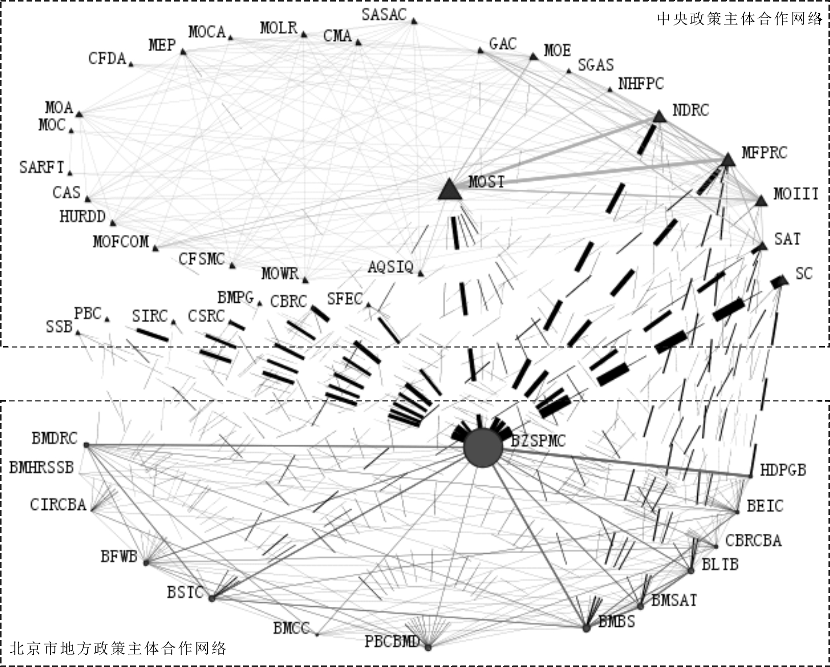 北京市科技创新主体形成了以中关村科技管理委员会(BZSPMC)为核心的网络结构特征(如图3)。该网络规模为35,网络密度为0.149。由此表明,北京市地方政府对于科技创新治理的重视程度较高,不同部门从不同角度对科技创新治理形成了规范,以指导北京市科技创新实践,并在实践中注重加强与其它部门的关系协调。中关村科技管理委员会作为北京市政策主体合作网络核心,具有较高的度中心性与中介中心性,在北京市科技创新治理中处于重要地位。相较于其它部门,中关村科技管理委员会发文最多,但与其它部门联合发文时均非第一政策主体,一般作为协调配合型政策主体存在。由此表明,中关村作为科教智力与人才资源集聚区,虽然在北京市科技发展中发挥了极强带动作用,但其离不开北京市财政局(BMBS)、北京市发展和改革委员会(BMDRC)、北京市国家税务局(BMSAT)和北京市科学技术委员会(BSTC)等掌握财政与行政资源部门的大力支持。