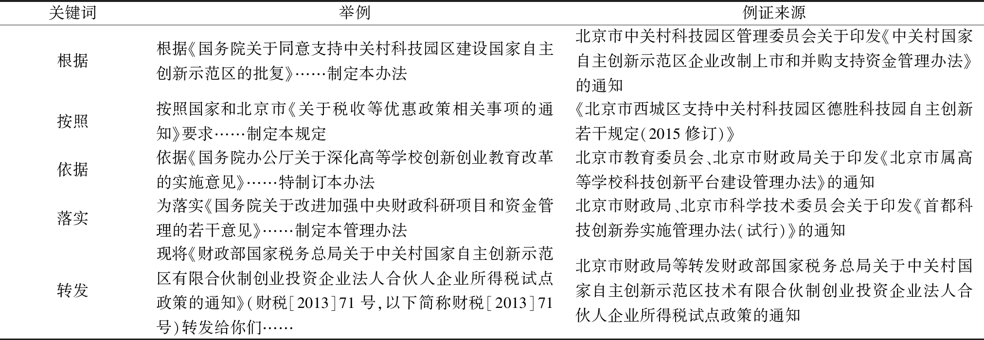 关键词举例例证来源根据根据《国务院关于同意支持中关村科技园区建设国家自主创新示范区的批复》……制定本办法北京市中关村科技园区管理委员会关于印发《中关村国家自主创新示范区企业改制上市和并购支持资金管理办法》的通知按照按照国家和北京市《关于税收等优惠政策相关事项的通知》要求……制定本规定《北京市西城区支持中关村科技园区德胜科技园自主创新若干规定(2015修订)》依据依据《国务院办公厅关于深化高等学校创新创业教育改革的实施意见》……特制订本办法北京市教育委员会、北京市财政局关于印发《北京市属高等学校科技创新平台建设管理办法》的通知落实为落实《国务院关于改进加强中央财政科研项目和资金管理的若干意见》……制定本管理办法北京市财政局、北京市科学技术委员会关于印发《首都科技创新券实施管理办法(试行)》的通知转发现将《财政部国家税务总局关于中关村国家自主创新示范区有限合伙制创业投资企业法人合伙人企业所得税试点政策的通知》(财税[2013]71号,以下简称财税[2013]71号)转发给你们……北京市财政局等转发财政部国家税务总局关于中关村国家自主创新示范区技术有限合伙制创业投资企业法人合伙人企业所得税试点政策的通知
