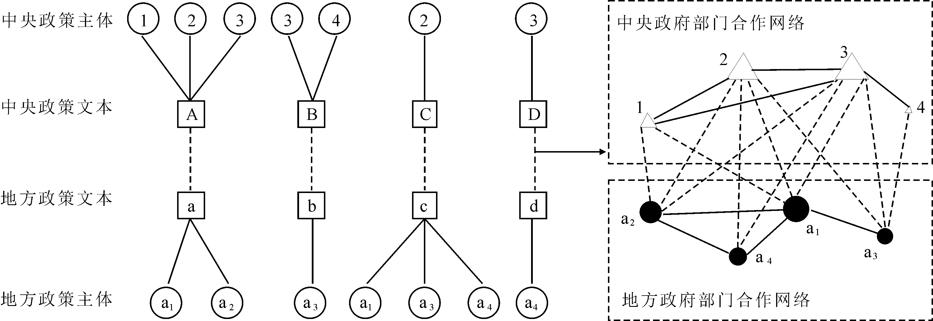 假设3个中央政府机构(1,2,3和4)与3个地方政府机构(a1,a2,a3和a4)分别参与制定了8个科技创新政策文件(A,B,C,D和a,b,c,d)。其中,实线反映了政府机构与政策文件的颁布关系,虚线反映了政策文件间的引用关系。这样,6个机构形成了8对政策主体合作关系,即1-2,2-3,1-3,3-4,a1-a2,a1-a3,a1-a4,a3-a4及12对政策主体执行关系,如1-a1,1-a2,2-a1,2-a2,3-a1,3-a2,4-a3,3-a3,2-a1,2-a3,2-a4,3-a4,见图1所示。其中,线条宽度代表政府机构间共同颁布或引用政策文件的频次;节点大小表示政策主体的程度中心性。实线表示同一层级政策主体间的合作关系,虚线表示不同层级政策主体间的合作关系,即央地关系。该中央-地方多层府际关系模型可进一步扩展,以作为分析中央政府部门、中央政府部门与省级政府部门、省级政府部门、省级政府部门与地级市政府部门关系的基础。
