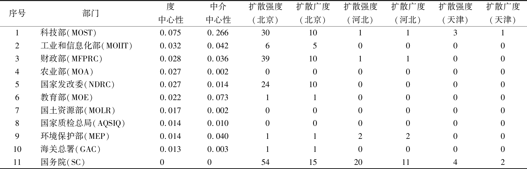 序号部门度中心性中介中心性扩散强度(北京)扩散广度(北京)扩散强度(河北)扩散广度(河北)扩散强度(天津)扩散广度(天津)1科技部(MOST)0.0750.266301011312工业和信息化部(MOIIT)0.0320.0426500003财政部(MFPRC)0.0280.036391011004农业部(MOA)0.0270.0020000005国家发改委(NDRC)0.0270.014241000006教育部(MOE)0.0220.0731100007国土资源部(MOLR)0.0170.0020000008国家质检总局(AQSIQ)0.0140.0100000009环境保护部(MEP)0.0140.04011220010海关总署(GAC)0.0130.00311000011国务院(SC)005415201142