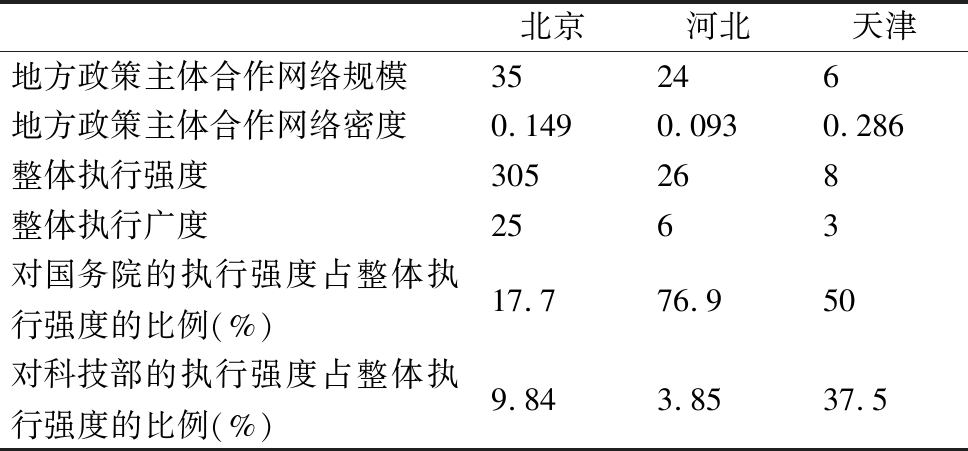 2017年首都科技发展战略研究院发布的中国城市科技创新发展报告显示,北京市科技创新综合指数为0.587,位居榜首,天津市与石家庄市分别位于第7位(0.416)与第55位(0.276)。因此,本文拟通过对比地方政策主体合作网络基本结构特征、地方执行中央政策的特征以及差异,探究造成地区科技创新水平差异的原因。其中,地方政策主体合作网络基本结构特征包括网络规模和网络密度,网络规模可反映为地方科技创新治理中地方政府部门的参与程度;网络密度表征了地方科技创新治理中地方政策主体的整体协调度。地方对中央的整体执行强度反映了地方对中央政策主体的执行积极度,以及地方对中央政策文本的熟悉度和理解度。地方对中央的整体执行广度表征为地方执行的中央政策主体个数,其数量与地方政策主体在科技创新政策制定中吸收的中央层面异质性资源量成正比。地方对不同中央政府部门的执行强度差异包括对国务院的执行强度占整体执行强度的比例、对科技部(职能性部门代表)的执行强度占整体执行强度的比例,比例大小反映了地方政策主体对执行中央政策主体的偏好。