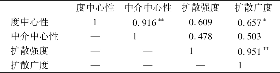 表4 中央政策主体网络结构特征与扩散特征相关性分析