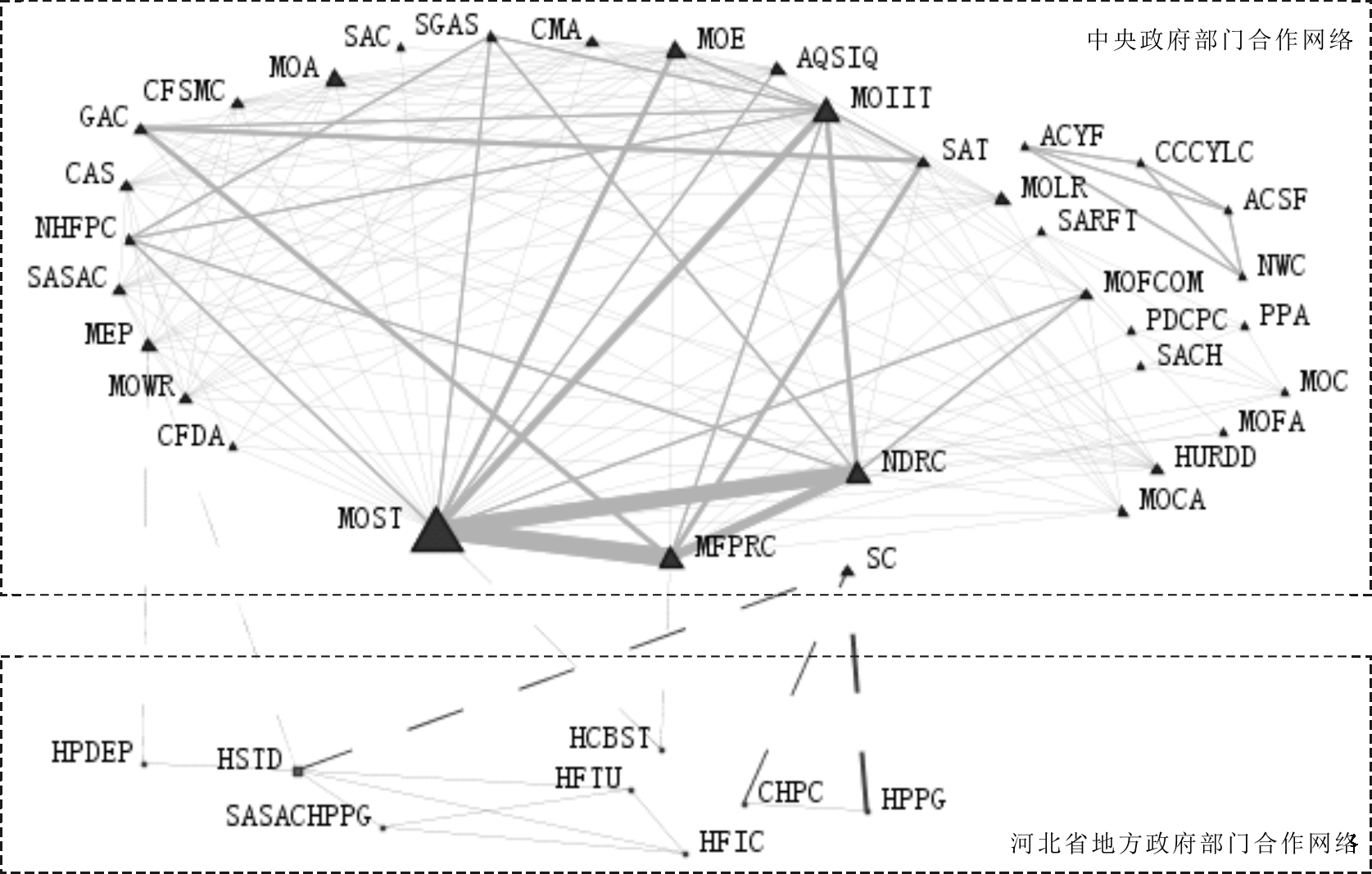 图4 中央-河北省府际关系网络(注:仅保留度大于1的节点)