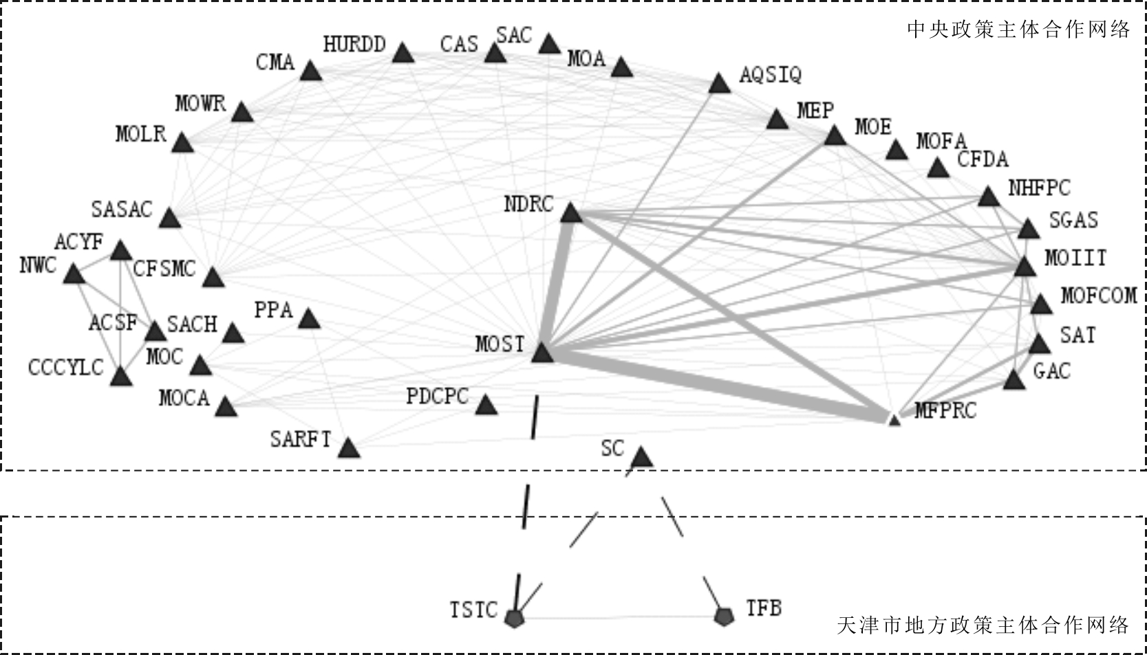 中央对天津市地方政府的政策扩散效应较弱。由图5可知,中央层面共有3个政策主体对天津市3个地方政策主体产生了政策扩散效应,中央对天津市的政策扩散核心主体为国务院(SC)、科技部(MOST),它们在天津市科技创新治理中发挥了较强的政策指导作用(见表2)。