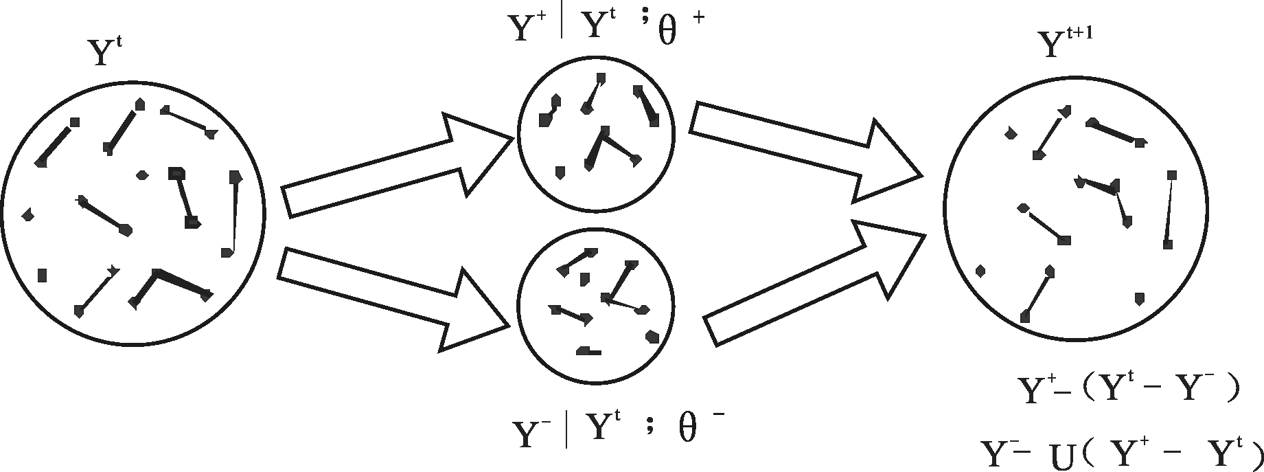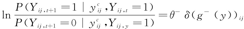 众所周知,指数随机图模型(ERGM)在静态网络建模中具有重要地位,随后Krivitsky & Handcock[16]、Hanneke & Xing[17]以及Hanneke[18]对该模型进行了改进,针对时序网络数据(以面板数据方式观察网络,类似将静态网络视为一个“切片”)引入一类时间指数随机图模型。同时,基于马尔科夫链这一动态随机过程,根据网络和各变量现状及其变化趋势,分别对边的形成和消失进行建模。具体而言,令Y(t)和Y(t+1)表示网络在t及t+1时刻的邻接矩阵,Y+表示初始网络Y(t)加上(t+1)时刻新形成的边,Y-表示初始网络Y(t)减去(t+1)时刻消失的边,如图1所示。