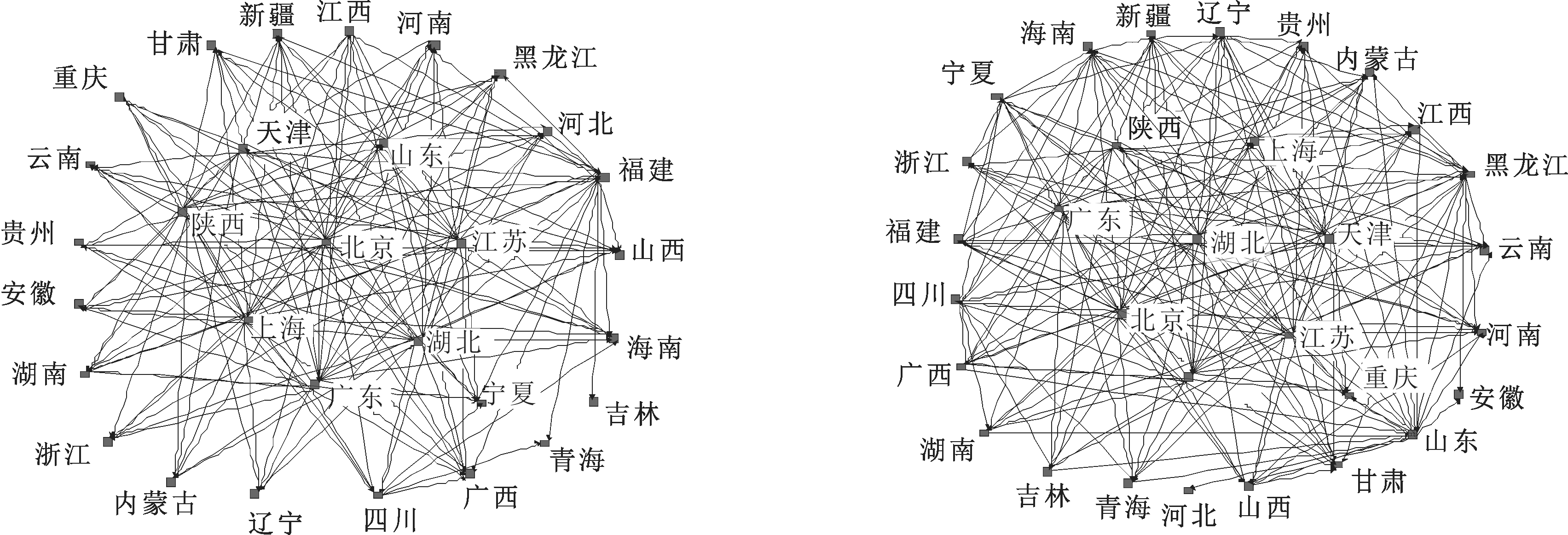 综上,本文从区域层面知识产权保护出发,选取2005、2009、2013、2017年我国内地30个区域(由于西藏数据严重缺失,此处研究样本暂未涵盖)技术市场的技术吸纳和技术输出成交额双向数据与历年各省(市、自治区)地区GDP的比值分别作势差(剔除负的势差),构建代表年份区域知识产权保护关联矩阵。具体实施过程如下:若t年区域i对区域j的知识产权保护强度势差大于历年各区域间知识产权保护正向势差的均值,表明t年区域i对区域j的知识产权保护强度在规模之上,则认为t年区域i倾向于对区域j的知识产权进行保护,关联矩阵对应元素Mij,t=1,反之为0。选取历年各区域间知识产权保护正向势差的均值作为网络边构建的阈值,主要是因为若分别以各年各区域间知识产权保护正向势差的均值作为各年区域知识产权保护网络边构建的阈值,就会忽略各年区域知识产权保护关系的增长趋势,选取一个统一的阈值可以有效保留各年区域知识产权保护关系的增长趋势。区域知识产权保护网络构建如图2所示。